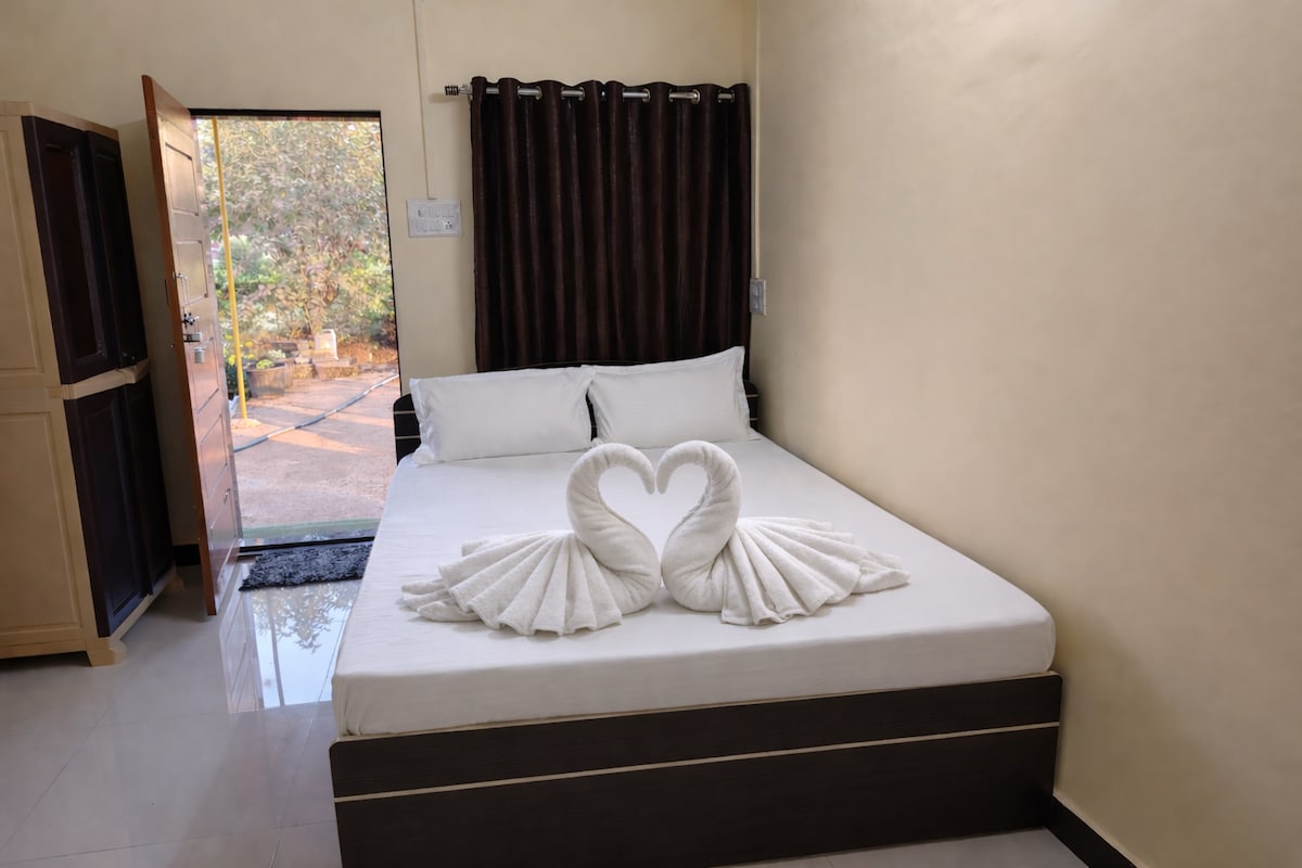 Mājīgs 2BHK mājoklis sulīgos apstādījumos, tikai 900 m attālumā no mierīgas pludmales. Maiņstrāvas istabas + liela zāle 10 viesiem. Izbaudiet skatu uz terasi, putnu dziesmu rītus un mierīgas naktis. Izpētiet mango dārzus, tuvumā esošos pakalnus vai atpūtieties ar grāmatu. Pilnībā aprīkota virtuve, mīļdzīvniekiem piemērota telpa ar vārtiem, atvērtas sēdvietas. Gardas jūras veltes, ko piedāvā šefpavārs. Ideāli piemērots ģimenēm un dabas mīļotājiem, kas meklē mieru, komfortu un piekrastes šarmu.