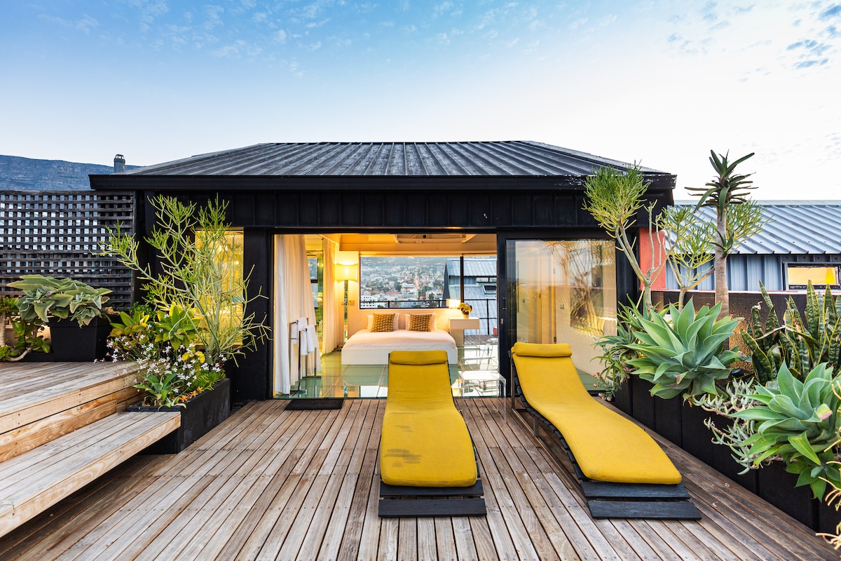 Izbaudiet skatu uz galda kalniem modernā jumta slēptuvē