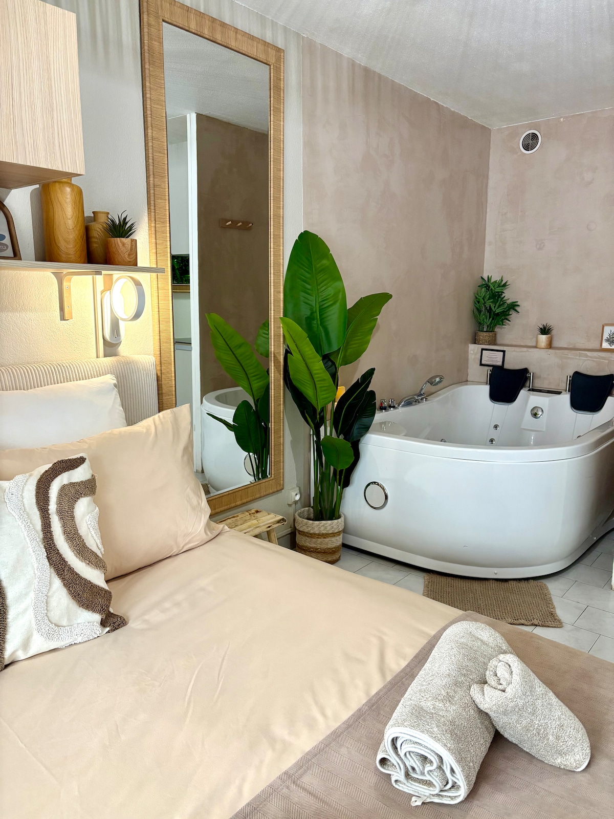 Suite de caractère situé entre Nîmes et Montpellier et à 30 min des plages. Complètement dédié à l’évasion, au repos et à la relaxation. Vous y trouverez tout le confort, un lit baldaquin queen, un vrai Jacuzzi américain 3 places, une cheminée électrique, une Tv 55', un canapé-lit, wifi et Netflix. Dans la sale de bain, vous trouverez une double vasque ainsi qu une douche. Dans la cuisine, vous trouverez le nécessaire pour réchauffer vos plats. Inclus place privé.