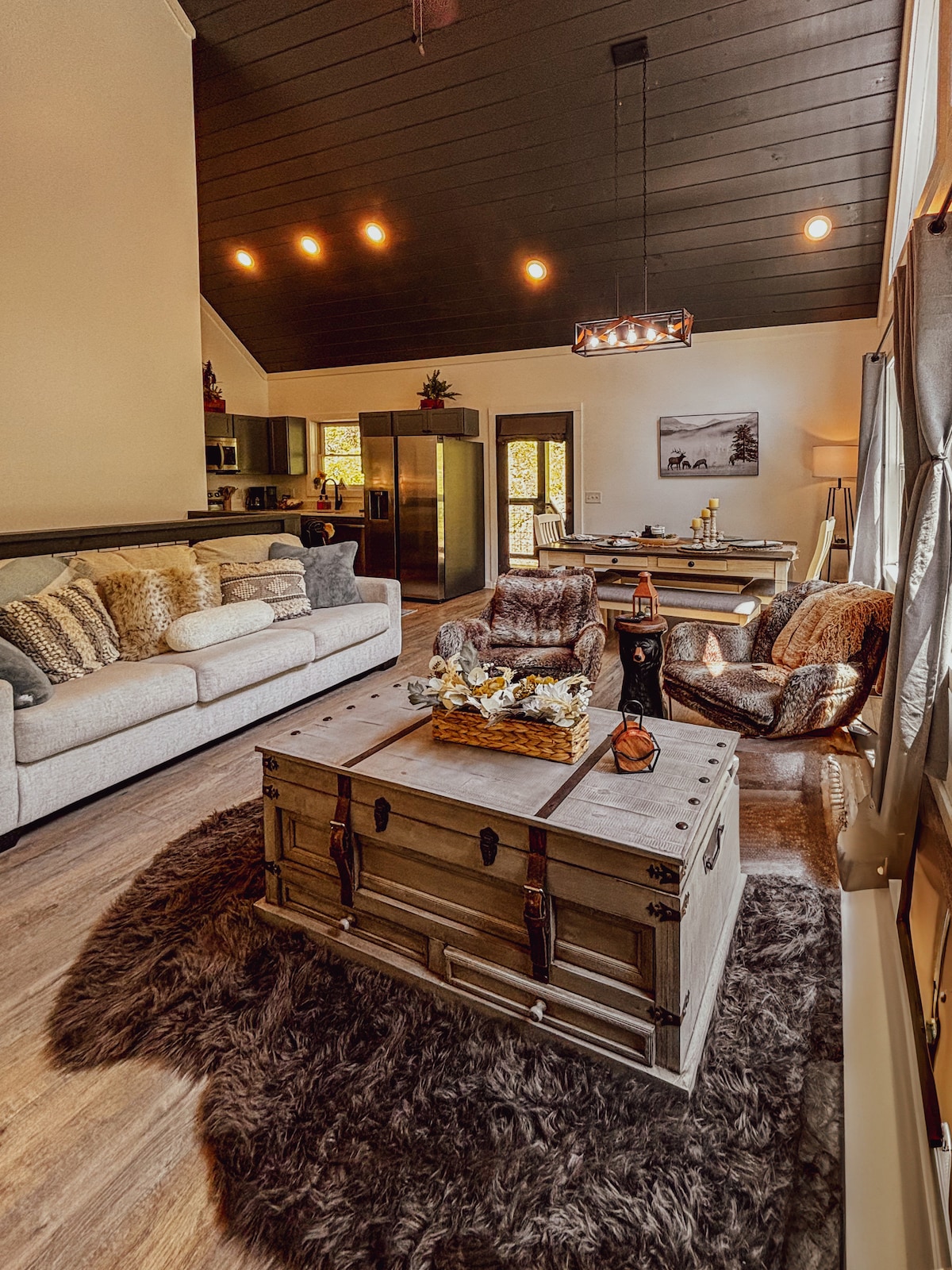 Aizbēdziet uz Three Pines Lodge - satriecošu modernu atpūtas vietu, ko ieskauj elpu aizraujošs skats uz kalniem. Izbaudiet ainavu pa plašiem logiem vai no āra izklaides telpām. Šī luksusa brīvdienu māja, kas paredzēta visu vecumu cilvēkiem, piedāvā izcilas papildērtības, tostarp burbuļvannu, arkādes spēles, Peloton velosipēdu un daudz ko citu! Izbaudiet nepārspējamu komfortu un radiet neaizmirstamas atmiņas kopā ar ģimeni. Rezervējiet atpūtu Dūmakainajos kalnos Three Pines Lodge jau šodien!