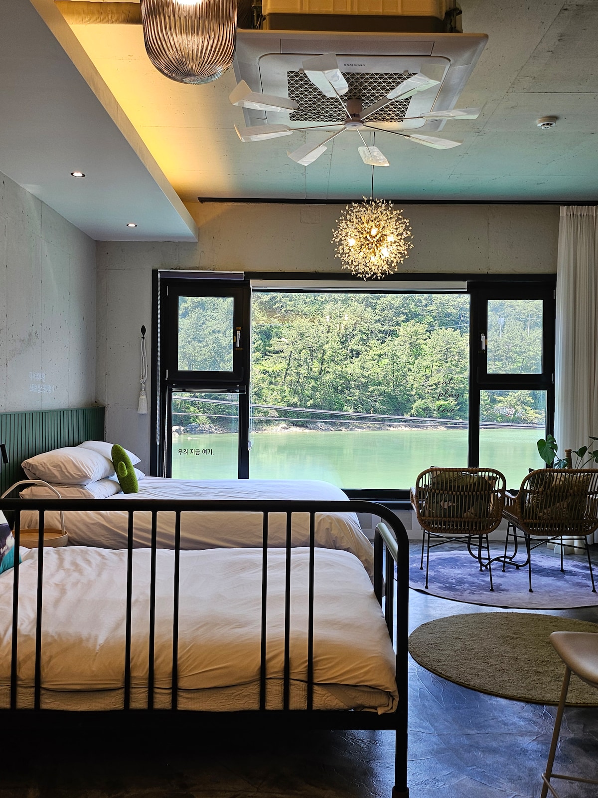 Sveiki, mēs esam Onda, kas pēta un nodrošina dažādas atpūtas zonas. Mēs ceram, ka ikvienam, kurš šeit uzturēsies, būs ērts un laimīgs laiks. [Par māju] Jūs varat baudīt labāko skatu uz Haegeum upi un Oedo Blue South Sea, un Wahyeon Sand Forest Beach, kas ir pilna ar smalkām smiltīm, atrodas 3 minūšu pastaigas attālumā, lai jūs varētu baudīt ūdeni pavisam netālu. Lūdzu, izveidojiet skaistu atmiņu lapu fantāzijas salā Geoje salā. [Istabas veids] Vienistabas tips + lofts + tualete [Piemaksa] Ja tiks pievienota papildu persona, tiks piemērota papildu maksa 10 000 KRW apmērā.