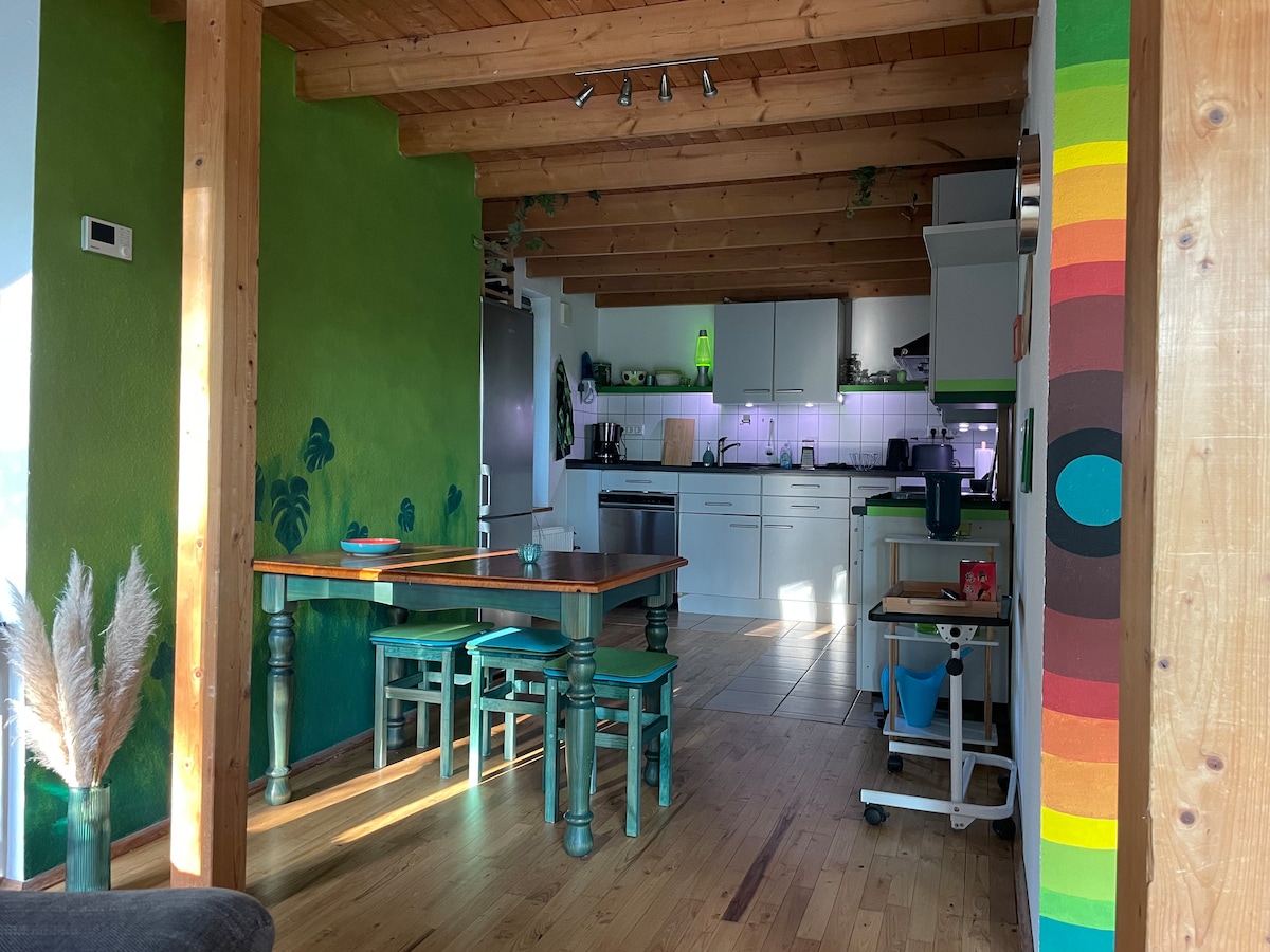 Laipni lūdzam mūsu brīvdienu dzīvoklī ar savu dārzu. Dzīvoklis atrodas augšstāvā, un tam var piekļūt pa kopīgu kāpņu telpu. Ir viesistaba/gulta/darba istaba ar divguļamo gultu (1,4 x 2 m) un vēl viena guļamistaba ar divām gultām. Vannasistaba ar dušu/vannu un pilnībā aprīkotu virtuvi. Pastaigas attālumā atrodas lauku saimniecības veikals un restorāns. Iepirkšanās iespējas, tūrisma sporta veidi un stacija ir sasniedzami 5 minūšu laikā ar automašīnu.