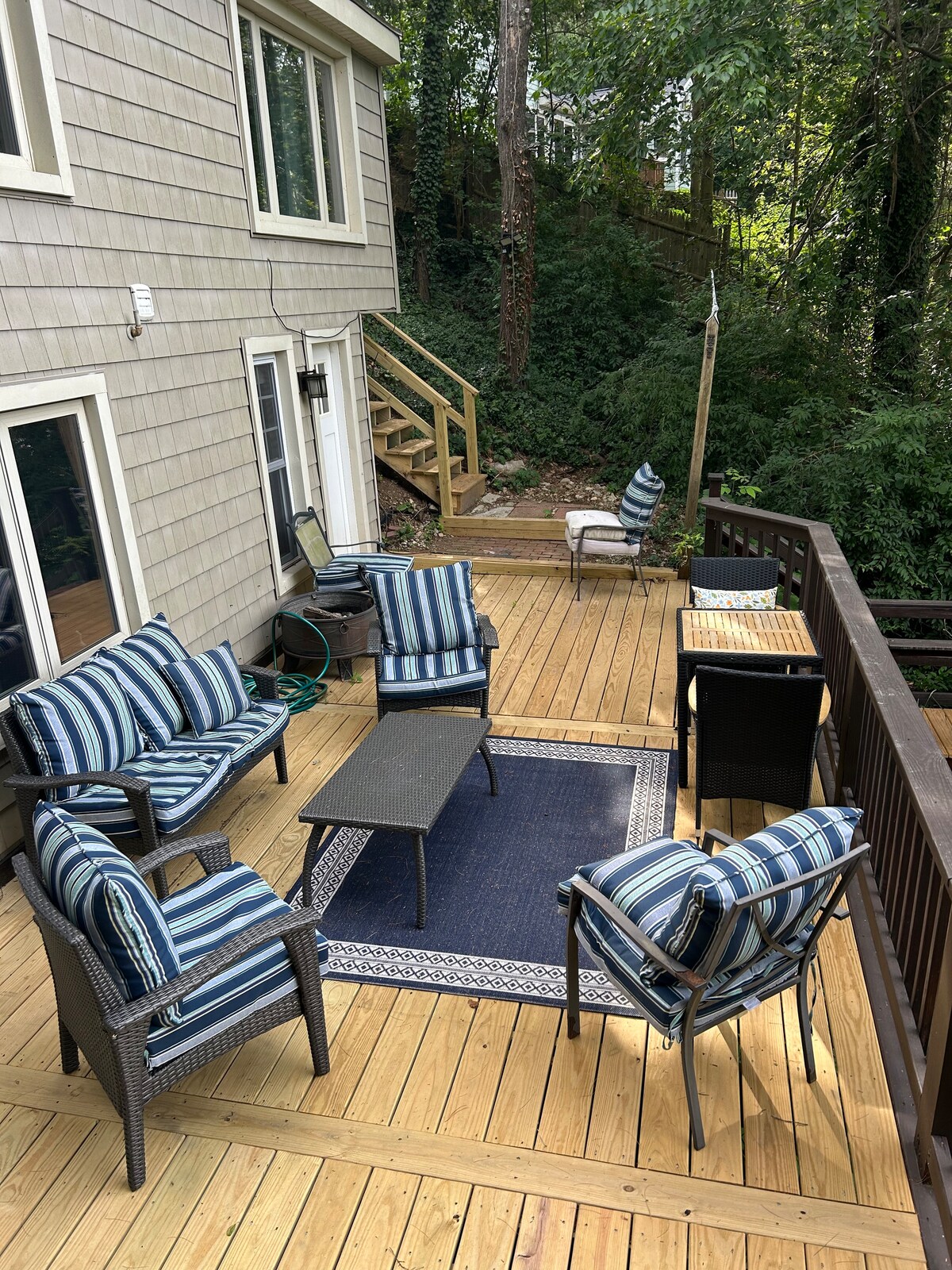 Our home is located on a wooded lot overlooking a pristine kettle pond. Access to our home requires ascending a long but gradual set of stairs followed by a second set of stairs to the entrance of the guest suite. The two room suite has a bedroom and a kitchenette with a microwave, toaster, electric kettle and mini frig. There is a French press, coffee bean grinder, tea, cups, dishes and flatware in the cupboards. It does not have a full kitchen ( no stove/ no kitchen sink)