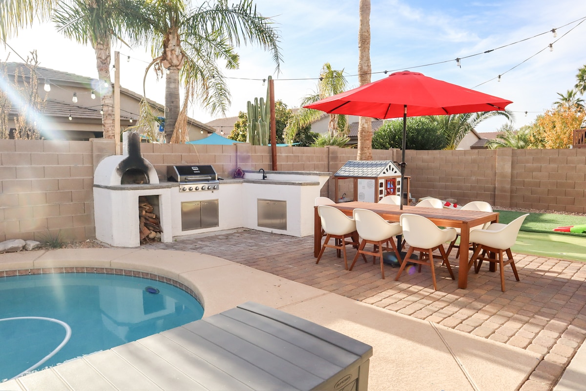 Dodieties prom uz Queen Creek! "Tuksneša dārgakmens" nodrošina viesu komfortu šajā skaisti iekārtotajā 4 guļamistabu mājā ar jaunām mēbelēm. Atvērta koncepta lieliska istaba ar virtuvi, ēdamistabu un ģimenes istabu ir ideāla vieta, kur kopīgi radīt jaunas atmiņas! Pagalmā ir privāts *apsildāms baseins, atzveltnes sauļošanās krēsli un milzīgs terases komplekts ar ugunskura galdu, kas noteikti būs iecienītākā vieta ikvienam jūsu uzturēšanās laikā! Visā mājā ir pievienotas daudzas papildērtības, lai viesi varētu atpūsties!