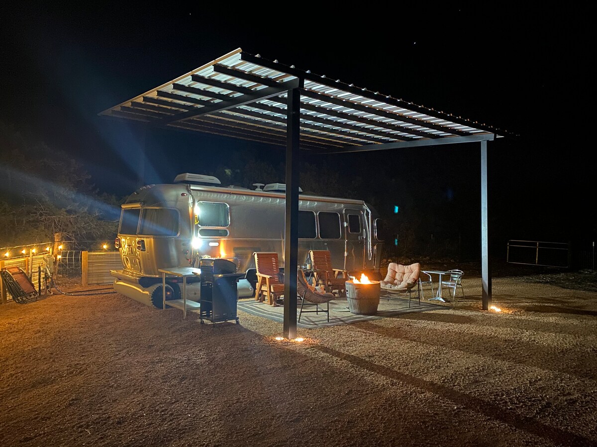 Izbaudiet šo jauko vidi romantiskā vietā dabā! Airstream Alfresco" atrodas tajā pašā īpašumā kā "Apkārt Bendas bungalo". Tā atrodas kalna virsotnē, no kuras paveras skats uz 48 akriem no W2 rančo. Izbaudiet rīta kafiju, aplūkojot barotavu, kas piesaista Whitetail Deer un Rio Grande Turciju starp viesabonēšanas ganāmpulka Teksasas Longhorns. Pēc nebeidzamām vīna darītavām un iepirkšanās, grauzdējiet neticamu saulrietu, pēc tam atpūtieties, skatoties uz plaši atvērtajām dziļi zilajām debesīm.