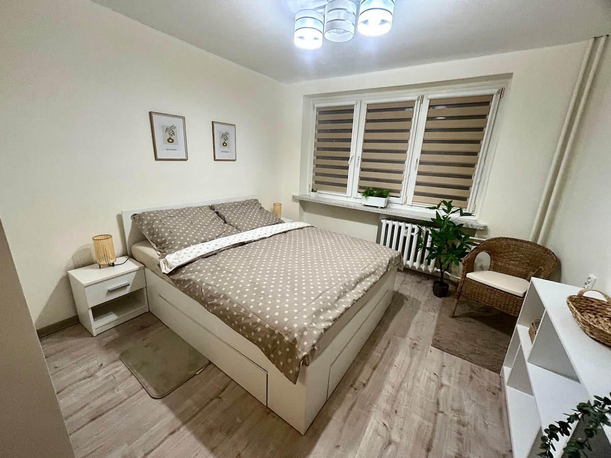 Laipni lūdzam! Ideāls ģimenes dzīvoklis ar panorāmas skatu uz Glivices terasi, kas ir ideāli piemērota kafijai. Sazinieties ar mums Airbnb platformā, lai saņemtu atlaidi. Aktualitātes: - Labākais skats uz Gliwice Airbnb (gandrīz 360° skats uz terasi). - 90 m no galvenā pilsētas laukuma - 55m², 2. stāvs, labiekārtotā ēkā - 8. guļamistaba: 2x guļamistaba ar divguļamo gultu, divguļamo gultu uz mezonīna, saliekams dīvāns diviem. - Pilnībā aprīkots ilgtermiņa rezervācijām: rakstāmgalds, virtuve, veļas mazgātava. - Kopstrādes telpa tuvumā. Atlaide par vismaz 2 dienām - nosūtiet man ziņojumu ❤️