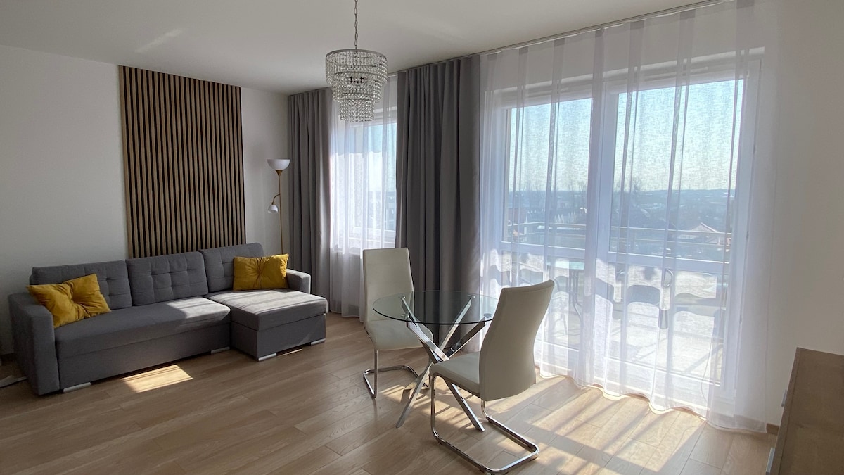 Gaišs, saulains dzīvoklis, kas sagatavots viesiem, kuriem patīk baudīt saulainu terasi. Dzīvoklī ir 50 m2 liela, tostarp dzīvojamā istaba ar minivirtuvi, guļamistaba, vannasistaba. Garāžas zālē ir autostāvvieta un platjoslas Wi-Fi, mini tornis ar Bluetooth un 43 collu televizors. Morenas galerija ir labi savienota tuvumā (8 min. pastaigas attālumā). Piemēram, 10. un 12. tramvajs - brauciena laiks 12 minūtes, autobuss Nr. 130 - brauciena laiks 17 minūtes.