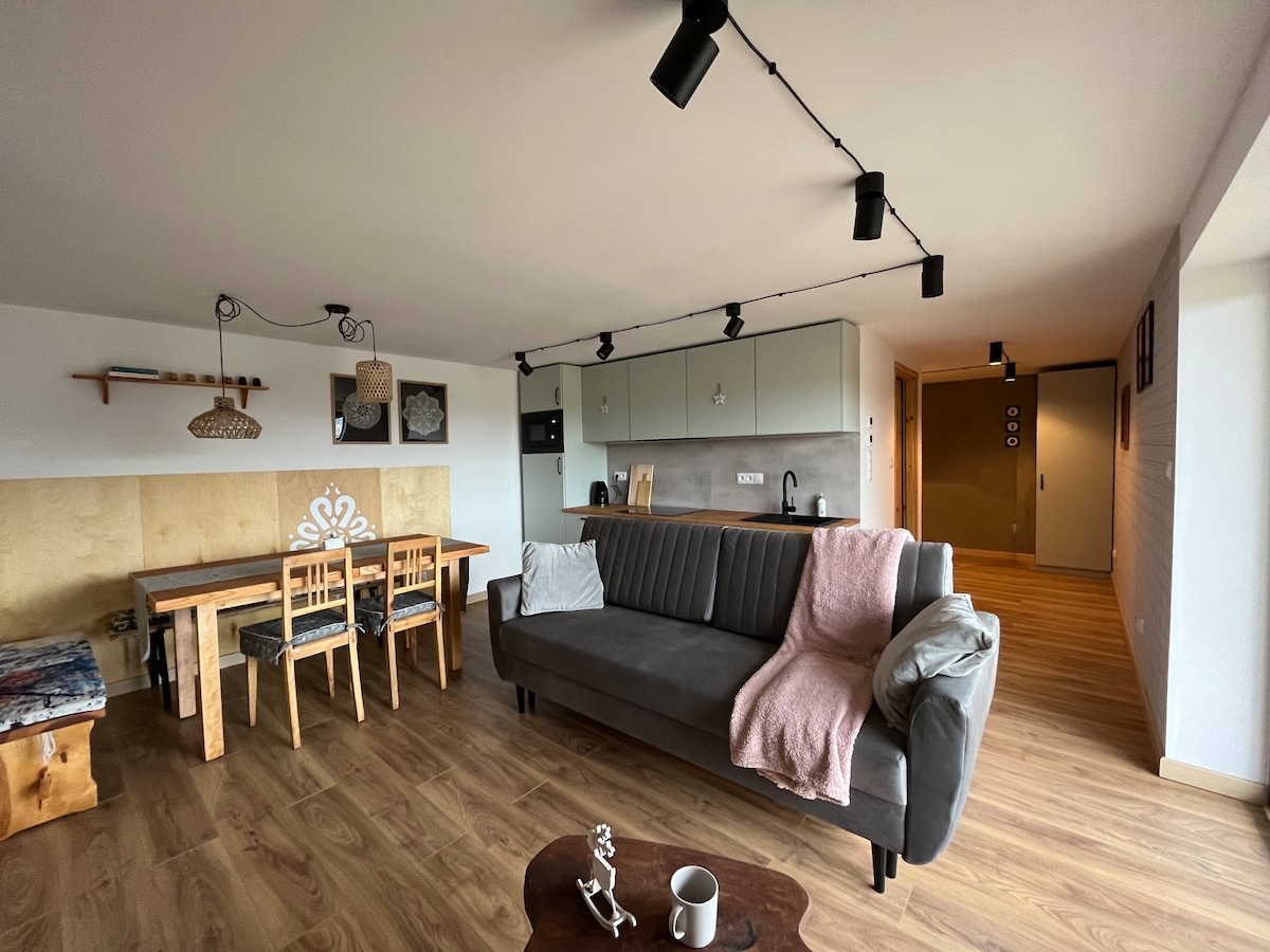 3. apmetne Harnasi 2 ir dzīvoklis, kas veido pusi no šķūņa tipa mājas ar tiešu ieeju no pagalma. Cenā ir iekļauta piekļuve burbuļvannai un pirtij. Tā ir vieta, kur atradīsiet mieru un klusumu. Mūsu lielākā atrakcija ir daba: meža skaņas, skati un smaržas, kā arī dzīves vienkāršība, pastaigas, rīta kafija uz klāja un vakara ugunskurs. Tuvumā ir daudz pārgājienu taku, pārgājienu vai riteņbraukšanas taku. Vieta ir arī laba bāze slēpošanai.