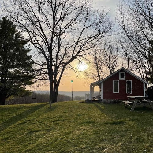 Funky, sakopts 23 gadus vecs lauku namiņš 120 akru plašā lauksaimniecības zemē un mežā privātā, klusā lauku vidē. Tā ir mājīga, 950 kvadrātpēdu liela, būvēta no akmens un koka. Atvērta koncepcija ar divstāvīgu kamīnu, verandas kamīnu, ugunskura vietu un atvērtu bēniņu gulēšanai (1 gulta), ar spirālveida kāpnēm, daudziem logiem, valriekstu grīdām un apdari, ozolkoka sijām un priežu virtuves virsmām. Duša ir liela un atvērta, ar durvīm, kas atveras uz aizmugurējo klāju āra dušai. Skaista, klāta veranda ar skatu uz pļavām un mežiem.