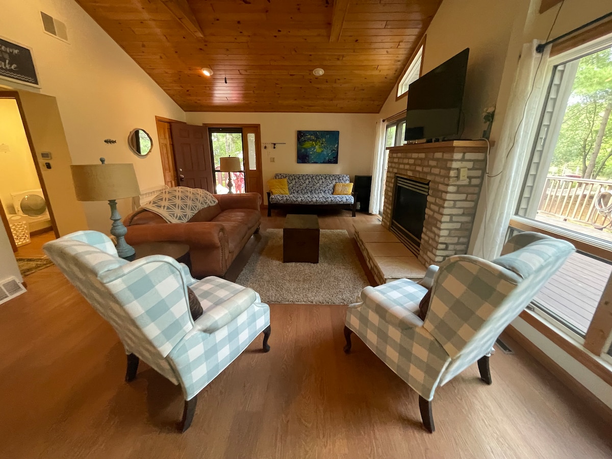 Laipni lūdzam ezerā! Šis 3 guļamistabu, 2 pilno vannu namiņš pie ezera atrodas uz neliela, klusa ezera, kas ir ideāli piemērots viesiem, kuri meklē atpūtu! Jauka smilšaina peldvieta ar pakāpenisku nogāzi bērniem. 3 pieaugušo kajaki, 3 jauniešu kajaki un daudz piepūšamo plostu un rotaļlietu. Mums ir ugunskura vieta ar skatu uz ezeru un norobežota terase, tostarp lapene ar moskītu tīklu un gāzes grils. ***Šis īpašums atrodas KLUSĀ, nelielā 8 akru ezerā, un tajā nav atļauti ar gāzi darbināmi motori.***