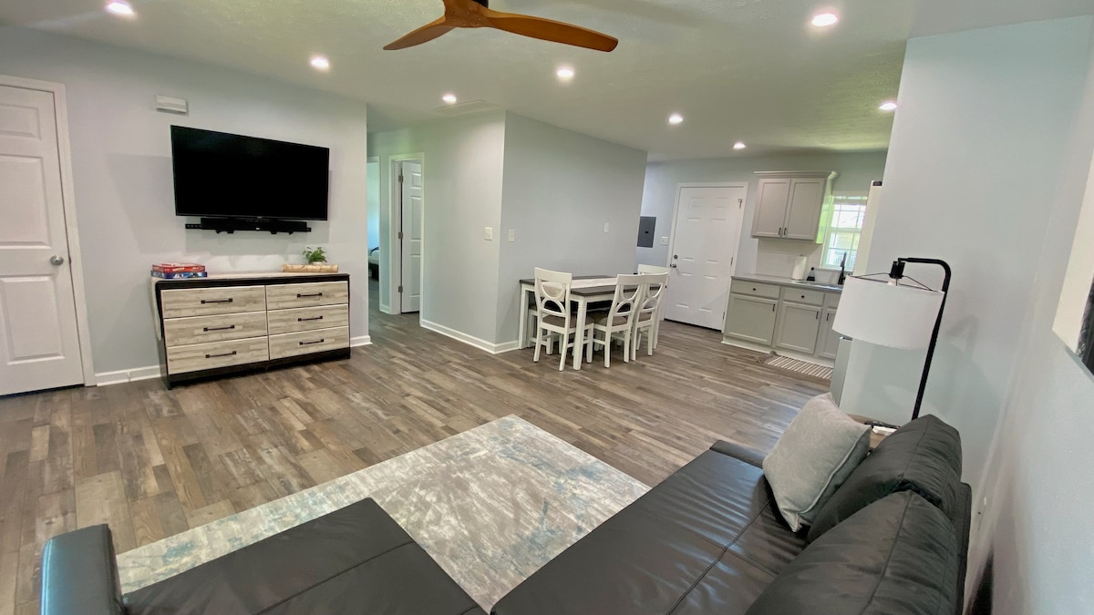 Mierīga lauku māja netālu no 3 Fat Labs un Depauw universitātes. Atrodas skaistā un klusā 1 akra stāvlaukumā ar ugunskura bedri. Atpūtieties uz aizmugurējā klāja un baudiet skatu, apmeklējiet Oukalas tiltu vai dodieties pārgājienā pa tuvumā esošajām Depauw dabas takām. Mājoklī ir "suite" tipa numurs ar "king" izmēra gultu un atvērtu stāva plānu. Bērnu istaba ar divstāvīgu gultu, rotaļlietām un rotaļu komplektu. Vanna 2. vannasistabā. Izbaudiet plašu DVD un spēļu izvēli bērniem un pieaugušajiem. Satelīttelevīzija un internets. Veļas mazgājamā mašīna/žāvētājs. Tikai 3,5 jūdzes līdz Depauw.