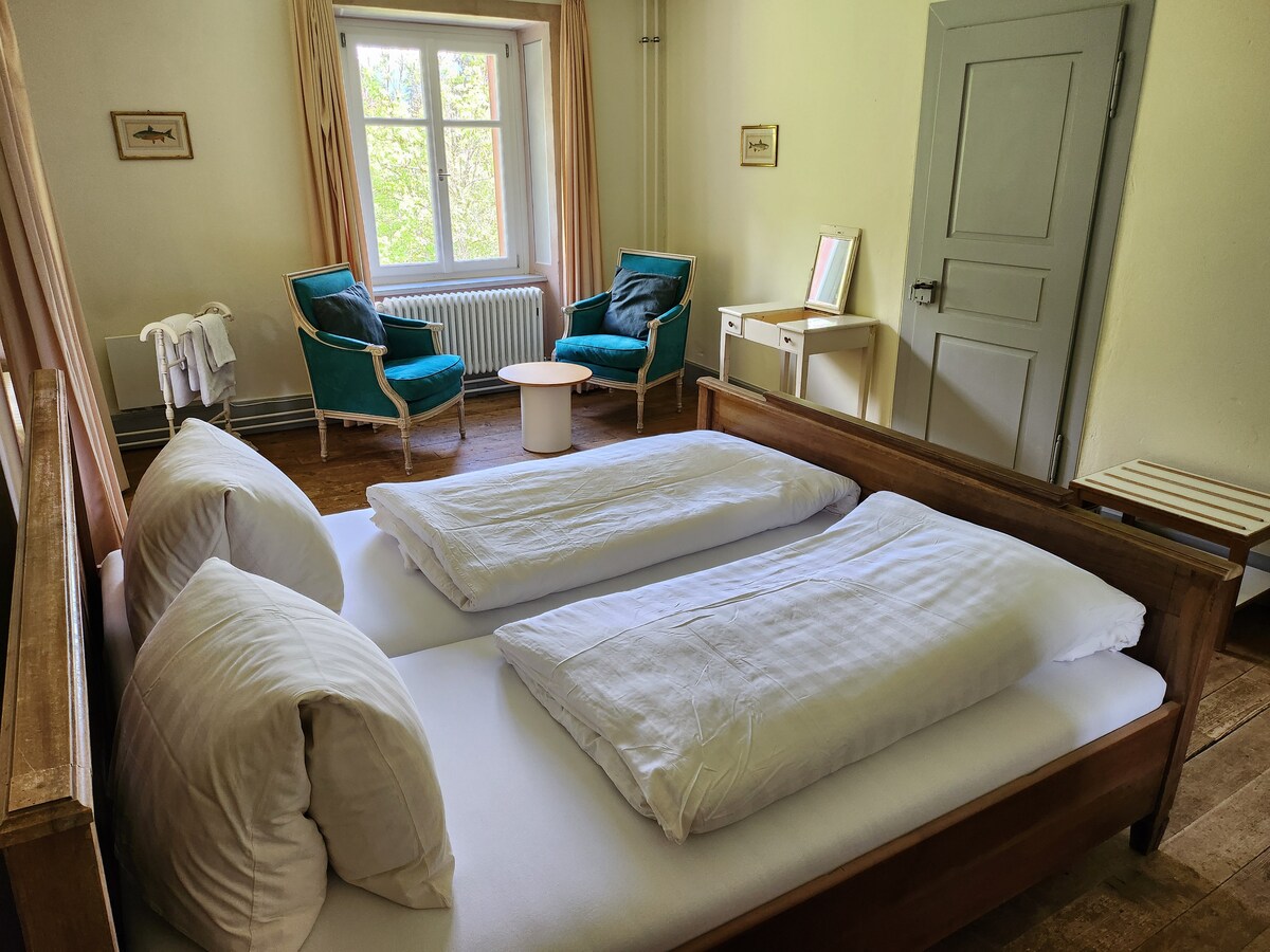 Die Suite ist ideal für längere Aufenthalte. Sie bietet auf ihren 27 m2 eine kleine Küche mit Kaffeemaschine, einen Ess- und Loungebereich, daneben ein gemütliches Bett (180 x 200), einen Schrank, eine Garderobe mit Kofferablage und ein edles Bad. Selbstverständlich hat die Suite Wifi, einen Safe und Fernseher. Küche: es gibt Pfannen aber kein Öl oder Gewürze. Bratpfannen sind wegen des Brandschutzes verboten. Haustiere bitte anmelden (kostenpflichtig).