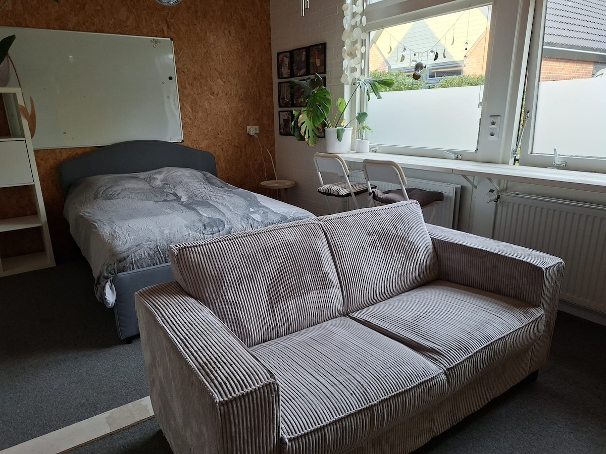 Brīnišķīgi atpūtieties šajā zaļajā oāzē netālu no Groningenas pilsētas. Pilnībā mēbelēta vienlīmeņa viesu māja diviem. Jums patiks sēdēt segtajā terasē zem vīnogu krūmiem ar glāzi vīna un labu grāmatu. Jūs varat ēst vīnogas, un varbūt no siltumnīcas vai dārzeņu dārza jūs gaida cukini vai citi augļi vai augļi. Mājā ir jauks liels dīvāns un rakstāmgalds ar labu Wi-Fi un lielisku skatu uz zemēm.