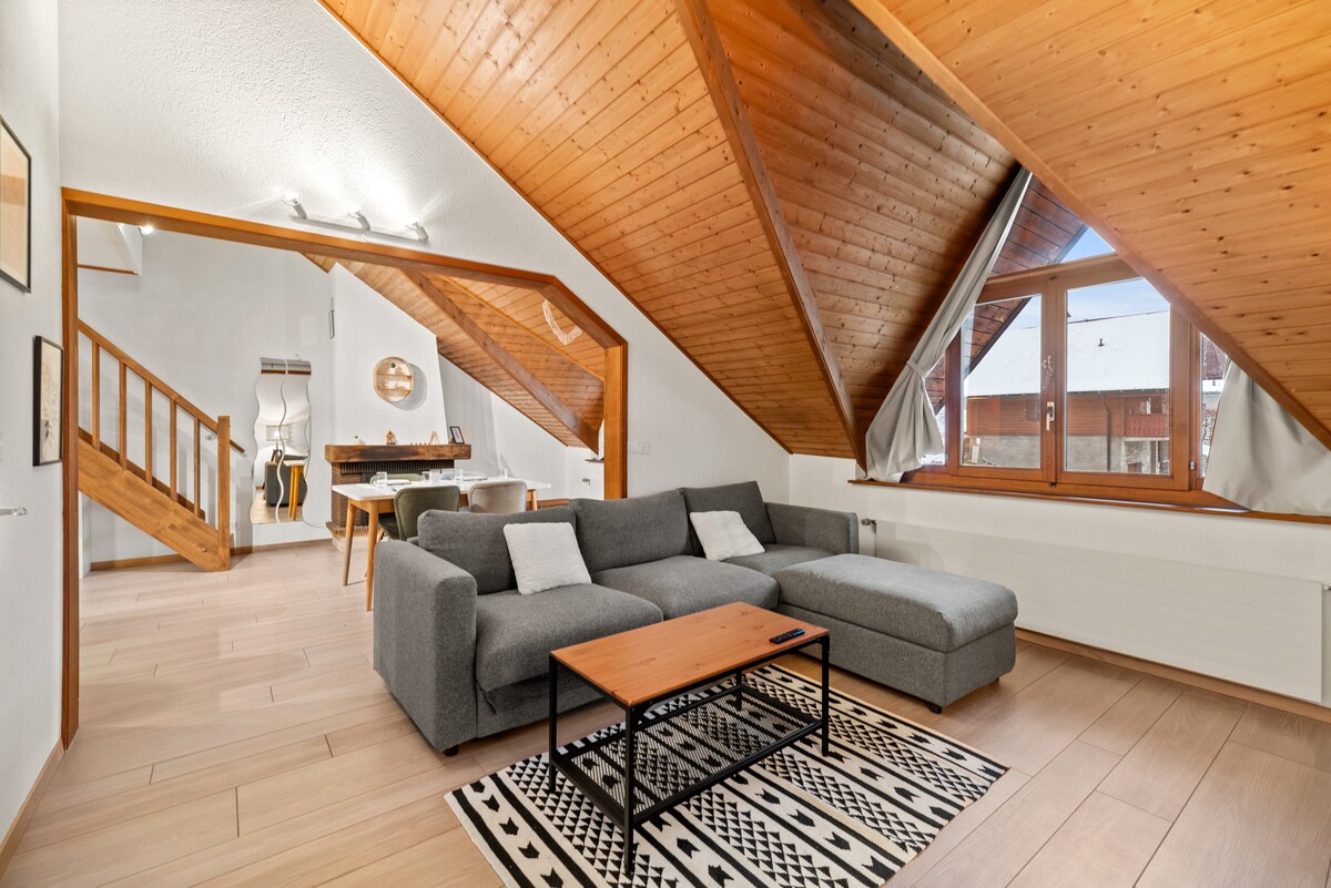 TIKKO IZREMONTĒTS! Gaišs, minimālistisks 120m2 divstāvīgs dzīvoklis vecā šķūnī. Mājīgs, moderns kalnu namiņa stils ar daudz koka un tradicionāliem akcentiem. Lieliski piemērots ģimenēm! 2 guļamistabas ar 6 gultām, ko var konfigurēt kā vienguļamās vai divguļamās gultas. Pilnībā aprīkota virtuve ar visām galvenajām ierīcēm un lielu ledusskapi un saldētavu. Satriecoši skati uz kalniem no 2 lieliem uz dienvidiem vērstiem balkoniem. Kalnu namiņš atrodas 10 minūšu gājiena attālumā no ciemata ar dzelzceļa staciju, lielu lielveikalu un pakalpojumiem.