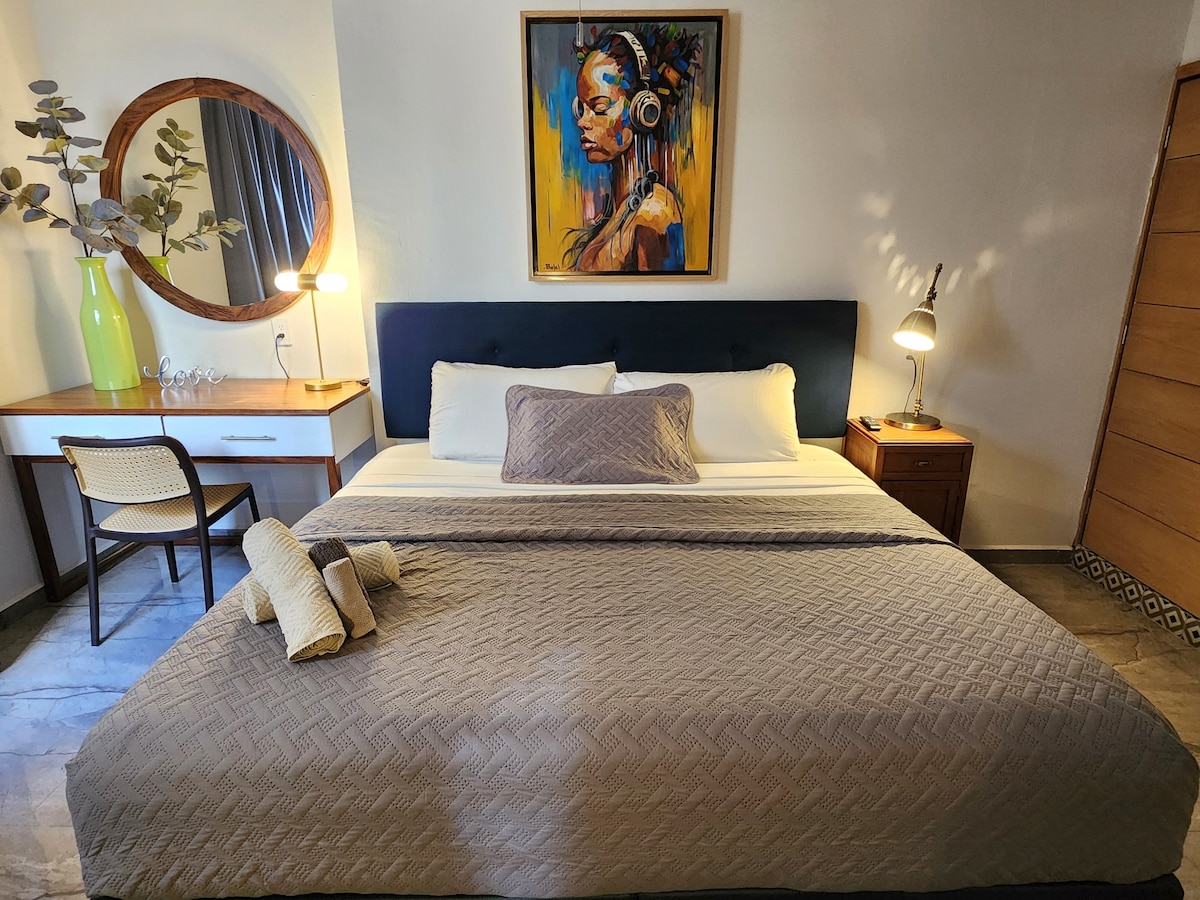 El estudio cuenta con lo necesario para pasar una estancia comoda y agradable, su terraza le da un ambiente de relajación, cuenta con un ventanal que permite ventilación y mucha iluminación, además tiene su propia cocina y su baño privado. Aquí podrás descansar gracias a la confortable cama que hemos preparado para ti, asi como una smart tv para que puedas disfrutar de tus series y programas favoritos. Nuestra recomendación es que disfrutes de la terraza con alguna rica bebida y compañía.