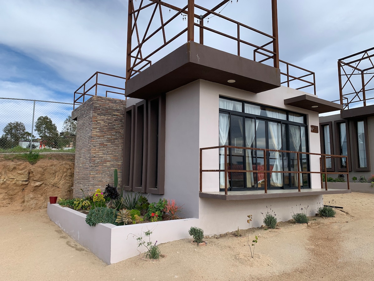 Dabas piepildīta atpūta, ko ieskauj ozoli un lekns augu valsts, ideāli piemērota atpūtai kopā ar ģimeni vai draugiem🌿. Atrodas Tecate-Ensenada šosejas 92. kilometrā, tikai dažu minūšu attālumā no Valle de Guadalupe, ar 2 jūdžu garu neasfaltētu ceļu, kas nodrošina privātumu un piedzīvojumu. Šajā namiņā ar 2 guļamistabām var izmitināt līdz 4 viesiem, un tas ir daļa no ilgtspējīga, no tīkla neatkarīga īpašuma ar visu nepieciešamo ērtai uzturēšanās vietai. Gaisa kondicionētājs ir pieejams tikai vasaras naktīs pēc plkst. 22.00.
