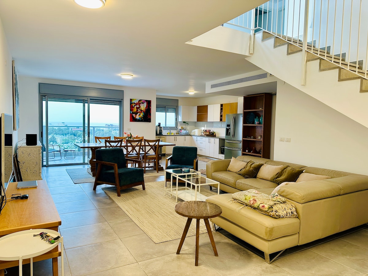 Two floors of a Luxury and exquisite penthouse, both looking onto the Mediterranean coast. Walking distance to the beach restaurants, groceries, Haifa mall, coffee shops, and coastal hiking trail. It is a 5-minute drive to many of Haifa's sightseeing destinations, including the Baha'i Shrine, the German colony, Stella Maris Monastery, and Mount Carmel National Park. It is a 5-minute drive to Ma Tam Industrial Center for business travelers.