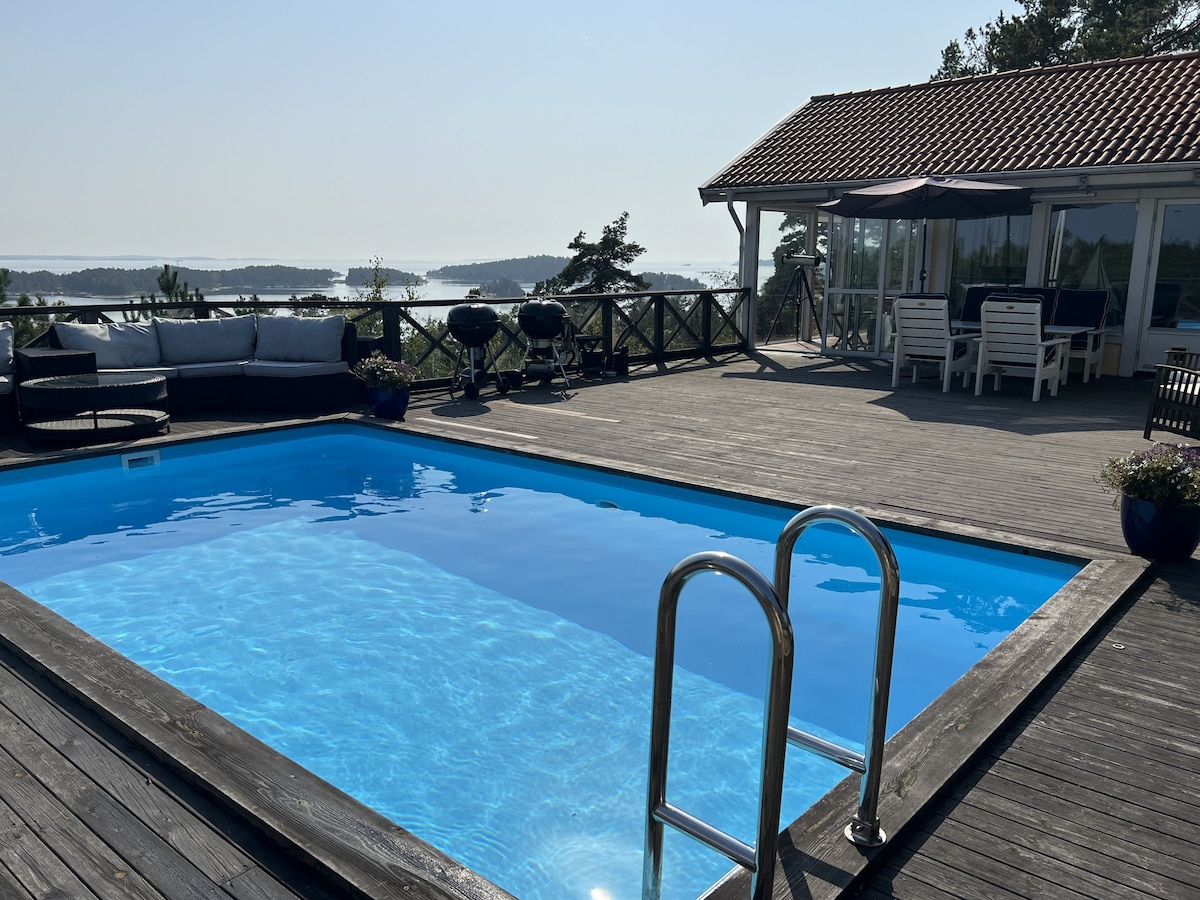 Ett paradis i Guldboda på södra Muskö, med storslagen utsikt över hela Stockholms södra skärgård, från Utö i norr till Landsort i söder. Vinterbonat fritidshus 95 kvm med tre sovrum, stort vardagsrum, swimmingpool, 100 kvm soldäck, gäststuga och 5 min promenad till havet, sandstränder, klippor och bryggor. Här finns fågelkvitter, smultron, älg och rådjur, lekplats, fotbollsmål och tennisbana, allt inom gångavstånd. Njut av en minnesvärd vistelse när du bor på detta unika ställe.