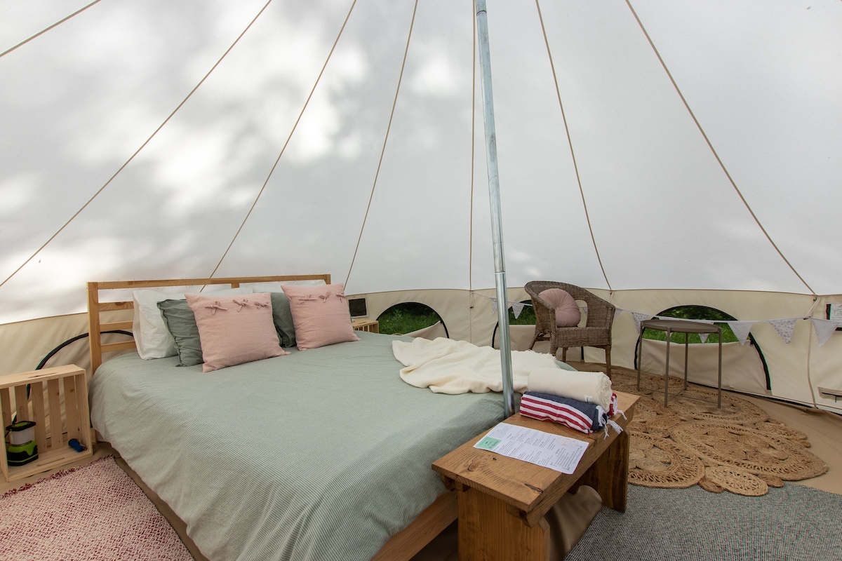 Imagine staying in a cozy bell tent nestled amidst serene surroundings. You have access to a beautiful lake, offering a wide array of outdoor activities. Whether it's kayaking, fishing, or simply enjoying a leisurely pontoon tour, the possibilities are endless. The bell tent offers a queen bed with linens and pillows, interior seating, solar power for basic electronics and charging, fan, access to games, outdoor BBQ, fire pit, muskoka chairs, picnic table and basic cooking utensils.