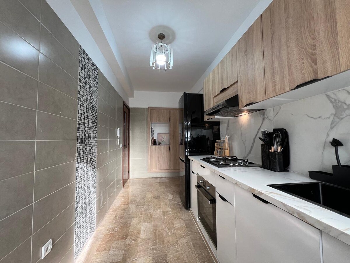 Elegants 90 m² dzīvoklis ar plašu dzīvojamo istabu un lielu galveno guļamistabu. Plašs un ērts, ideāli piemērots pāriem, ģimenēm un darījumu ceļotājiem ✅ Pašreģistrēšanās visu diennakti ✅ Terases visā īpašumā ✅ Apsargāta dzīvojamā ēka + autostāvvieta ✅ Wi-Fi / Netflix / IPTV ✅ Aprīkota virtuve, 2 vannasistabas 🔆 Panorāmas skats no galvenās guļamistabas Stratēģiska atrašanās vieta: tikai piecu minūšu gājiena attālumā no Prince Moulay Abdellah stadiona – ideāli piemērota, lai nepalaistu garām nevienu no 2025. gada Āfrikas Nāciju kausa spēlēm