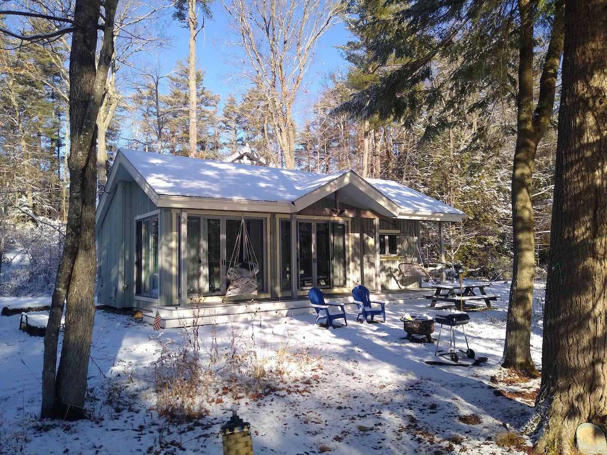 My year-round A-Frame cabin is 30 min to Mount Sunapee, 20 min to Crotched, and 15 min to Pat's Peak! It’s on a small 32-acre pond in New Hampshire. It is truly heaven on earth. There is over 100 feet of direct waterfront. There is a 6 foot main dock, and a small fishing dock off to the side. The fishing on our pond gets rave reviews! Most people catch and release, but please follow NH fishing laws: 16+ needs a license. The property sits on 1/3 of an acre, on a sloped hill.