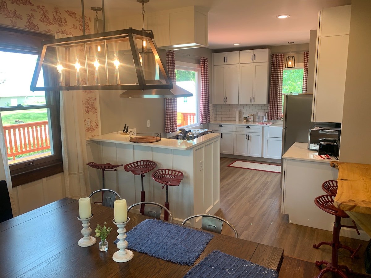 Atpūtieties no pilsētas šajā 1923. gada vēsturiskajā dārgakmenī strādājošā saimniecībā. Mūsdienīga lauku māja ietver WiFi, 65collu viedtelevīziju un pilnībā aprīkotu modernu virtuvi. Galvenajā stāvā ir birojs/lasītava (divguļamais dīvāns) un dzīvojamā istaba ar ērtām sēdvietām visiem. Augšstāvā galvenajā guļamistabā ir divguļamā gulta un privātā vannasistaba. Otrajā guļamistabā ir 2 pilna izmēra gultas. Trešajā guļamistabā ir divguļamā gulta. Bēniņu slēptuve, 4 vienguļamās gultas, 2 logu sēdekļi. Plaša terase, pastaiga dabā.