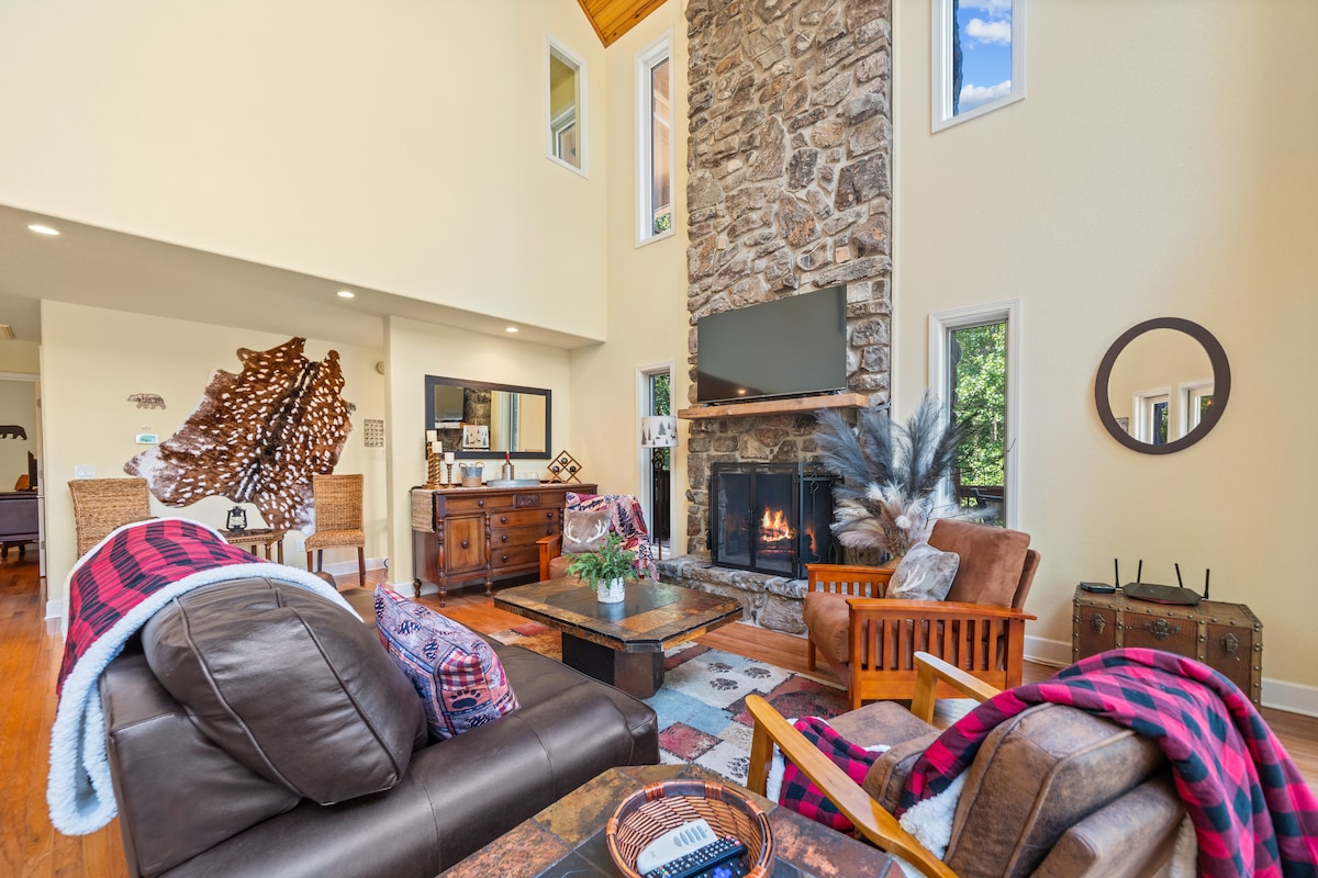 Atrodas mežainā oāzē - ideāla vieta, kur izbaudīt atpūtu. Šis mājoklis ar visām jūsu uzturēšanās papildērtībām un atrodas ciemata centrā, un tas ir aprīkots, lai jūs varētu baudīt gan iekštelpas, gan ārtelpas. Brokastojiet koku galotnēs uz klāja kopā ar putniem un vērojiet briežus. Milzīga ugunskura vieta, šūpoles un pakavu bedre izklaidei ārpus telpām. Ģimenes istabā ir akmens kamīns no griestiem līdz grīdai un milzīga sekcija! Luksusa gultasveļa, dvieļi un tualetes piederumi, lai jūs varētu izbaudīt atvaļinājumu!