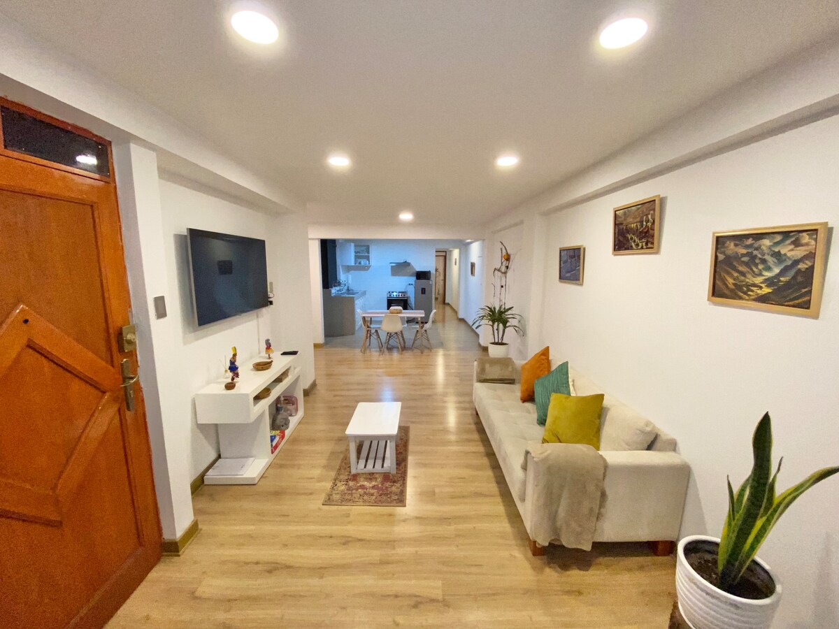 Cien. viesi! Laipni lūdzam Valentinos House, 2 minūšu gājiena attālumā no Plaza de Armas de Huaraz, tuvumā ir lieliskas vietas, kur paēst, pastaigāties, apmeklēt tirdzniecības centru un sporta zāli, jūs neko netērēsiet transportam No dzīvokļa paveras neticams skats uz kalniem un Kubas parku, šī vieta ir gaismas pilna, lieliska vieta, kur atpūsties un ieturēt brokastis, vērojot kokus un kalnus. Aprīkots ar plašu viesistabu, aprīkotu virtuvi, terasi, karstu ūdeni,TV55 ", ātrgaitas internetu