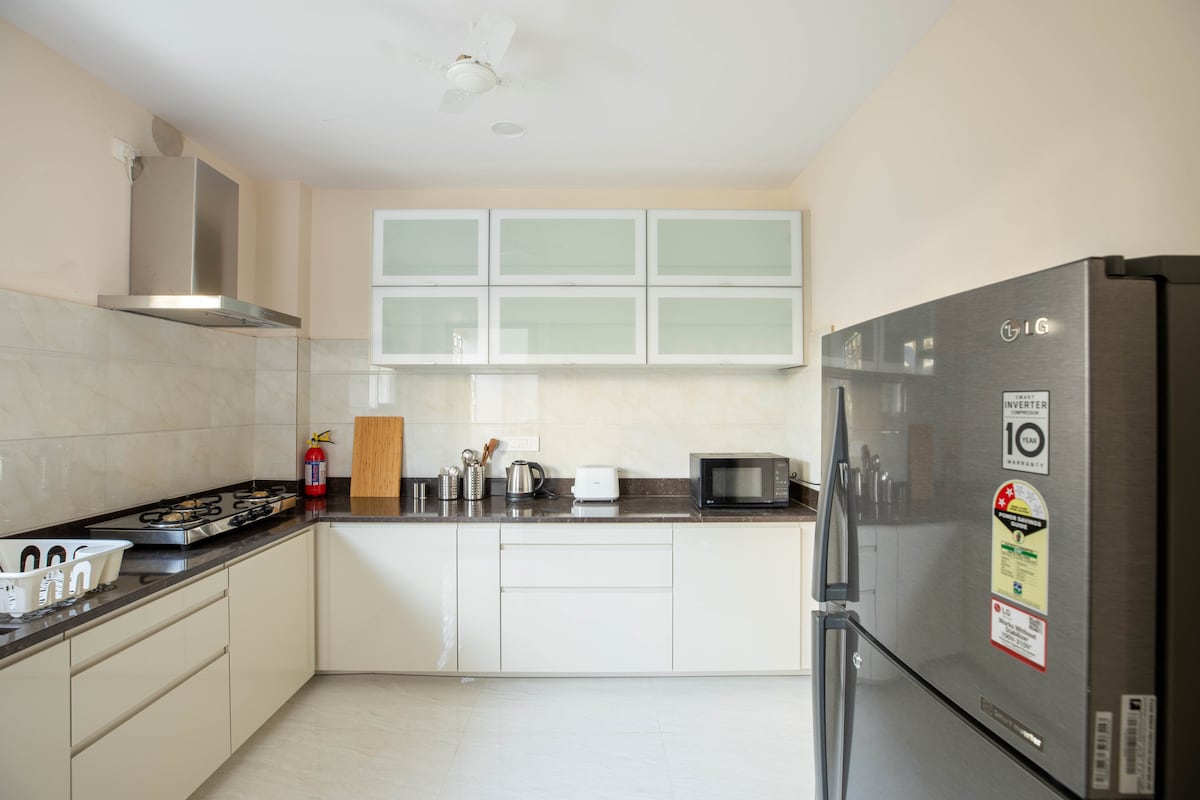 Dodieties uz mūsu elegantajiem divu guļamistabu apartamenti Haidarābādas augstākās klases Banjara kalnos. Šī mūsdienīgā atpūtas vieta ir ideāli piemērota ģimenēm vai darījumu ceļotājiem, un tajā var izmitināt 4 viesus. Izbaudiet ātru Wi-Fi, pilnībā aprīkotu virtuvi un privātu balkonu. Tā atrodas netālu no HITEC City, populārākajām iepirkšanās vietām un ēstuvēm, tāpēc tā ir ideāla mājvieta. Drošs, privāts un stilīgs. Šī mierīgā vide, kas atrodas netālu no labākajām slimnīcām, ir ideāli piemērota pacientiem un viņu ģimenēm. Piezīme: šī ir viena no divām ēkas vienībām, kas atrodas APAKŠĒJĀ LĪMENĪ