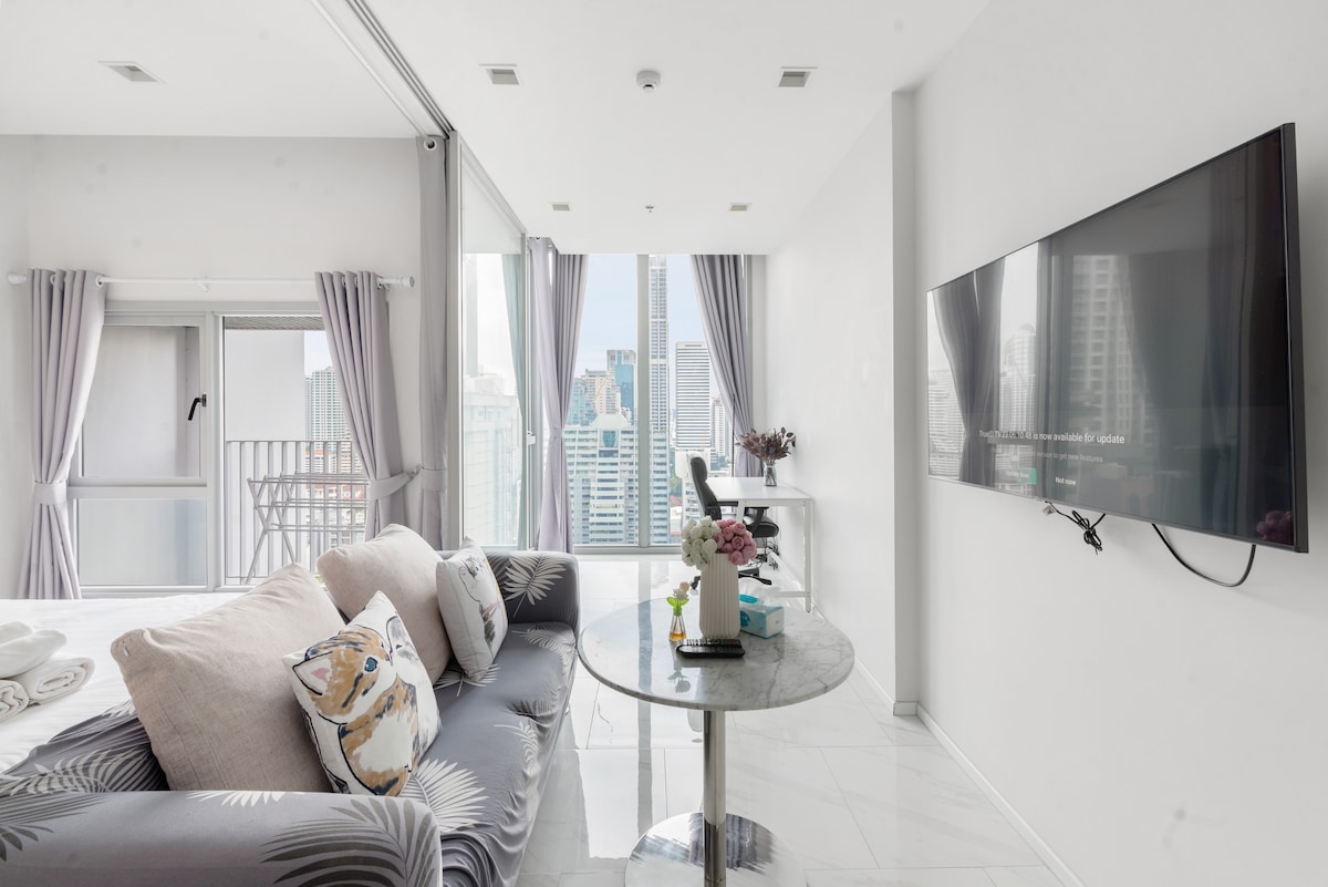 ** Free Early Check-in and Late Checkout! ** Modern 1BR apartment on the 21st floor with stunning Bangkok skyline views. Located in a luxury building with high security, and full in-room amenities: hi-speed Wi-Fi, smart TV, washer/dryer. Easy access to BTS, taxis, and public transport. Pool, sauna, and gym facilities are available for long-stay guests only, as per building policy.