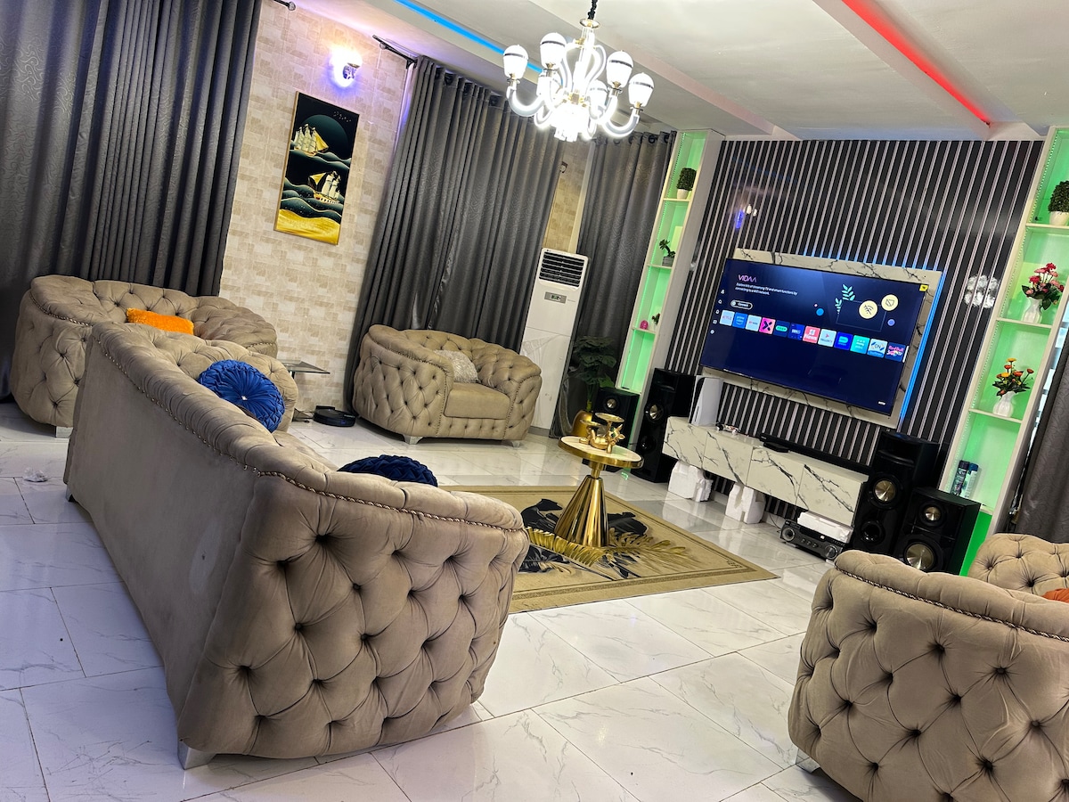 D'EXQUISITE APARTMENTS, newly built property with state of the art luxury amenities in a serene, peaceful, family friendly and unique environment close to attractions , malls, lounges/bar e.t.c . 24/7 Electricity, Free internet/WIFI, free parking and spacious compound that can be utilised for party/ gathering. The whole group will be comfortable in this spacious and unique space with 24/7 security personnel and supporting staff onsite for free cleaning services.