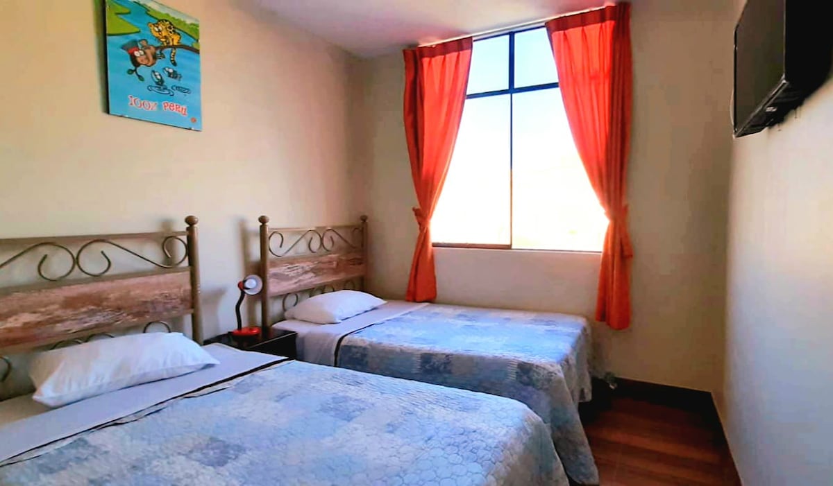 Acogedor hotel donde quedarse con desayuno incluido (NO APLICA en fin de semana o feriados) y recepción las 24 hrs. Nuestra habitación cuádruple cuenta con un baño privado externo de la habitación. Nos encontramos ubicados en la mejor zona de Ica, cuentas a poca distancia de los mejores centro comerciales, restaurantes y casinos, a tan solo a 8 min del Oasis de Huacachina y a 1 cuadra del museo regional de Ica.