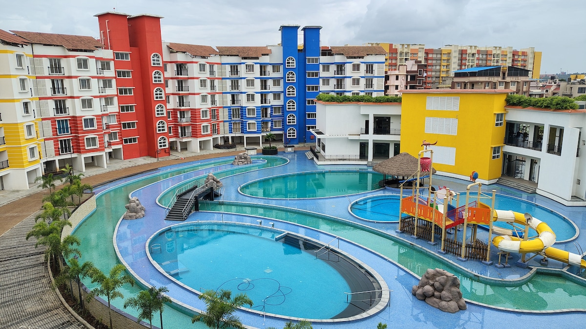 Cristelle's Heartwood Haven with big Pool area & Gym close to Jacinto Island & just 5 mins from the Airport. Have fun with the whole family at this stylish & unique place !! The 2BHK has a fully functional Kitchen ,water filter & washing machine too that can make you feel at home . The 2BHK can accommodate a total of 6 guests with 2 Queen Size bed and 1 queen size sofa cum bed. You will have access to swimming Pool , Gym, Billiards, Yoga room, Library, Foosball, Pool Table.