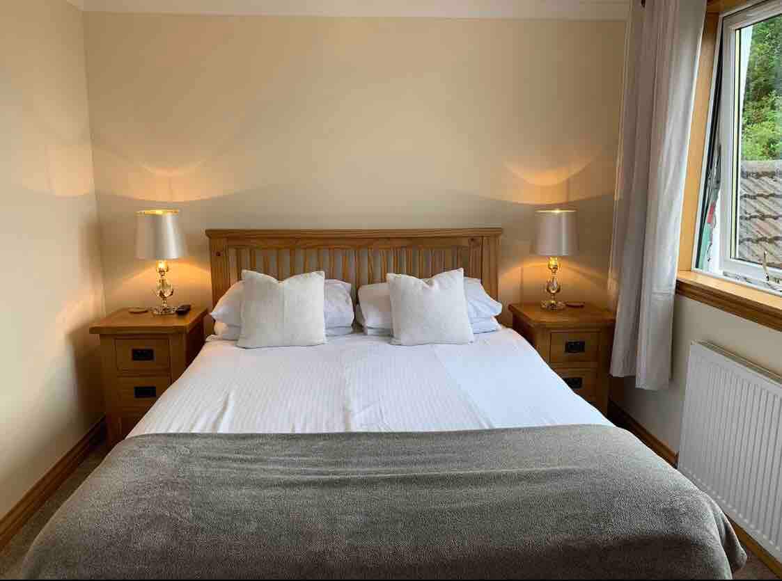 Complimentary Breakfast Grey coloured room with grey/white bedding with Stag feature. Towels supplied along with soap shampoo and toilet roll. There is a drawer in the bathroom “forgotten items and face clothes for guests use" & ahairdryer in the room .Room consists of bedside cabinets with 3 drawers ,dressing table, built in wardrobe, king size bed ( uk size ) TV courtesy tray and small fridge. Private bathroom A service wash is available by host £ 10 per load washed Dryer £10 a load