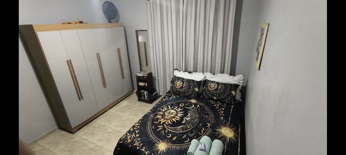 Espaço aconchegante, muito bem centralizado. Próximo dos principais mercados, farmácia, panificadora, lojas. Dispõe de uma cama confortável, cobertores e travesseiro, guarda roupas. Na sala, sofá, TV, ar condicionado. A cozinha é equipada com mesa e 2 cadeiras, geladeira, fogão, armário, chaleira elétrica, cafeteira, pratos, xícaras, copos, talheres. No banheiro temos toalhas, shampoo, condicionador, sabonete. Wi-fi e tudo que você precisa para uma experiência inesquecível.