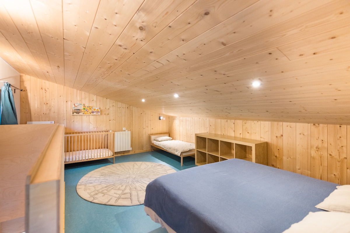 4 atsevišķi kalnu namiņi ar kopīgu atvērtu telpu, kas atrodas lieliskā meža apvidū ap ezeru : "Les nids du Chat". Jūsu kalnu namiņš ir ideāli piemērots pārim ar mazuli : liela kopdzīvojama istaba 2 pieaugušajiem (King izmēra dabiskā gulta 160 cms X 200 cms), koka bērnu gulta un pārtinamais galds un bērnu gulta 70x140 cms (no 3 līdz 6 gadu vecumam), atvērta virtuve, kas ved uz viesistabu, ko var mainīt uz pieaugušo istabu, vannasistabu un lielu uz dienvidiem vērstu terasi.