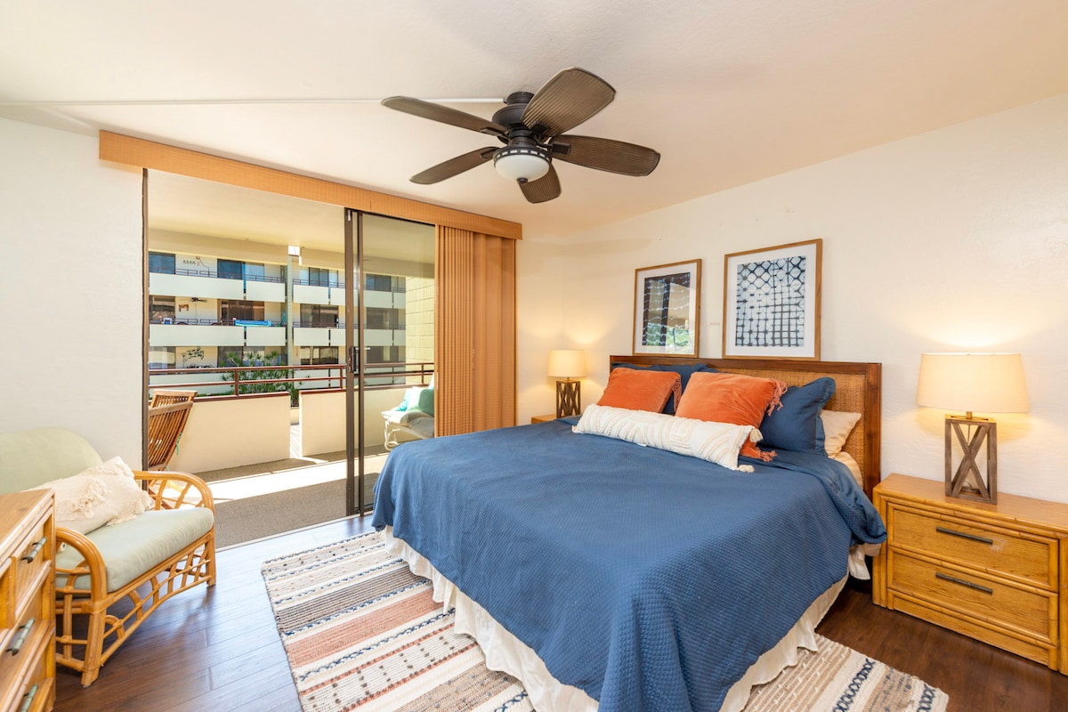This adorable condo, is tastefully decorated with a light, happy, colorful, Hawaiian feel. With a king sized bed, air conditioning and quality sheets for bedding. Everything for that" HOMEY" feel is included. The complex being Oceanfront adds to the amazing experience , as well as the perfect sunsets. See the ocean and listen to the crashing waves from the Lanai. On property, is a sandy beach, a convenience store with a fresh market across the way. The location is close to downtown.
