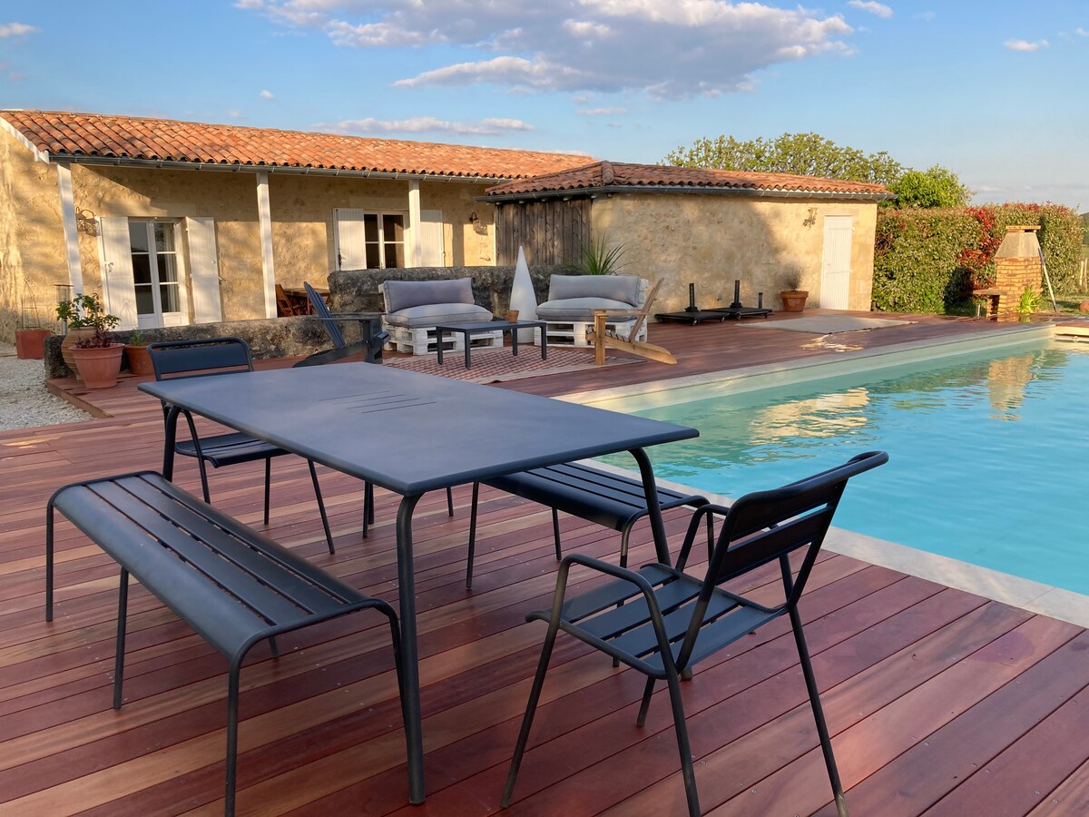 Pašā Entre-deux-Mers sirdī atrodas kotedža vīna īpašumā ar lielisku skatu uz vīna dārziem un apkārtējo ieleju. Tās priviliģētā atrašanās vieta netālu no Bordo (18 km), Bassin d 'Arcachon, Saint Emilion, veicinās patīkamus apmeklējumus. Segta terase, dārzs, autostāvvieta, dārza mēbeles un grils. Baseins rezervēts kotedžas īrniekiem un sauļošanās gultām. Miers un privātums ir nodrošināti. Pilnīga iegremdēšanās Bordo vīna dārzā!