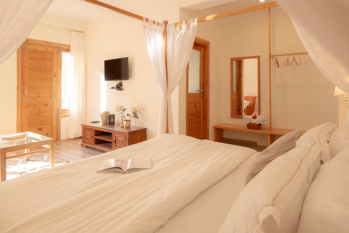 Kalnu māja, kas atrodas ābeļdārzā ar 2 īpašām viesu istabām, kurās 1 istaba ir piestiprināta ar virtuvīti un higiēniskām vannasistabām, un 1 istaba ir laba izmēra guļamistaba. Mūsu domēns ir neaizmirstams skats uz kalniem, mierīga atrašanās vieta, govs piens un mierīga apkārtne. Mūsu māja ir aprīkota ar visām pamatērtībām un vispiemērotāko miera meklētājiem Himalajos un īpaši grāmatu mīļotājiem, meditācijas praktiķiem un putniem.