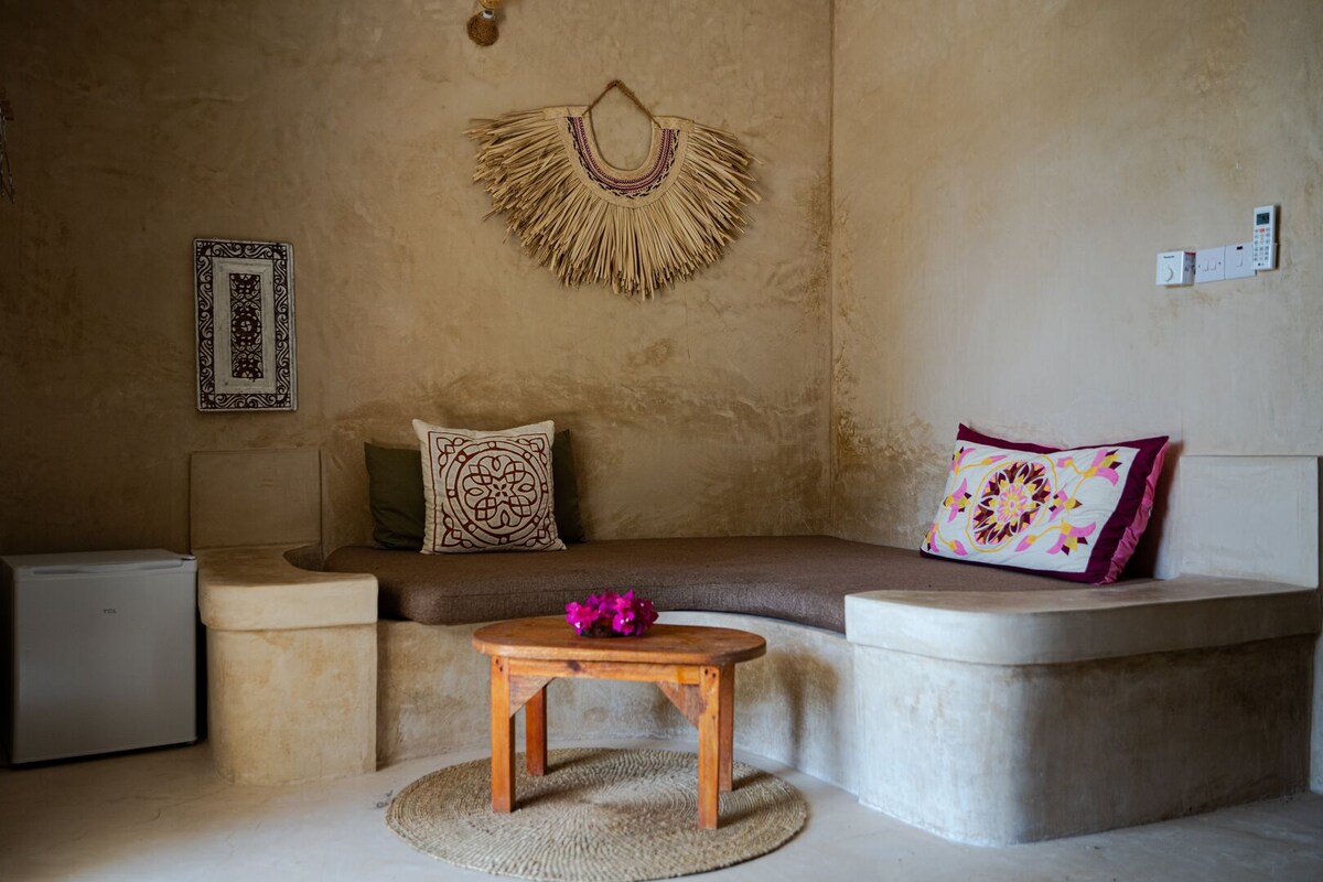 Aizbēdziet uz mūsu mierīgo viesu namu, kas atrodas Zanzibāras krūmā. Mierīgā un gaišā numurā ir privāta vannasistaba, balkons un ieeja. Istabā ir liela izmēra gulta(185x190 cm), kas nodrošina maksimālu komfortu. Kopīgojiet mūsu āra virtuvi un segtu sēdēšanas zonu. Mūsu sporta zāle atrodas netālu (5 pastaigas minūtes); par papildu samaksu ir pieejamas jogas, deju, boksa un fitnesa nodarbības. Skaistā pludmale ar restorāniem atrodas 10 minūšu pastaigas attālumā. Izbaudiet mieru un ērtības paradīzē.