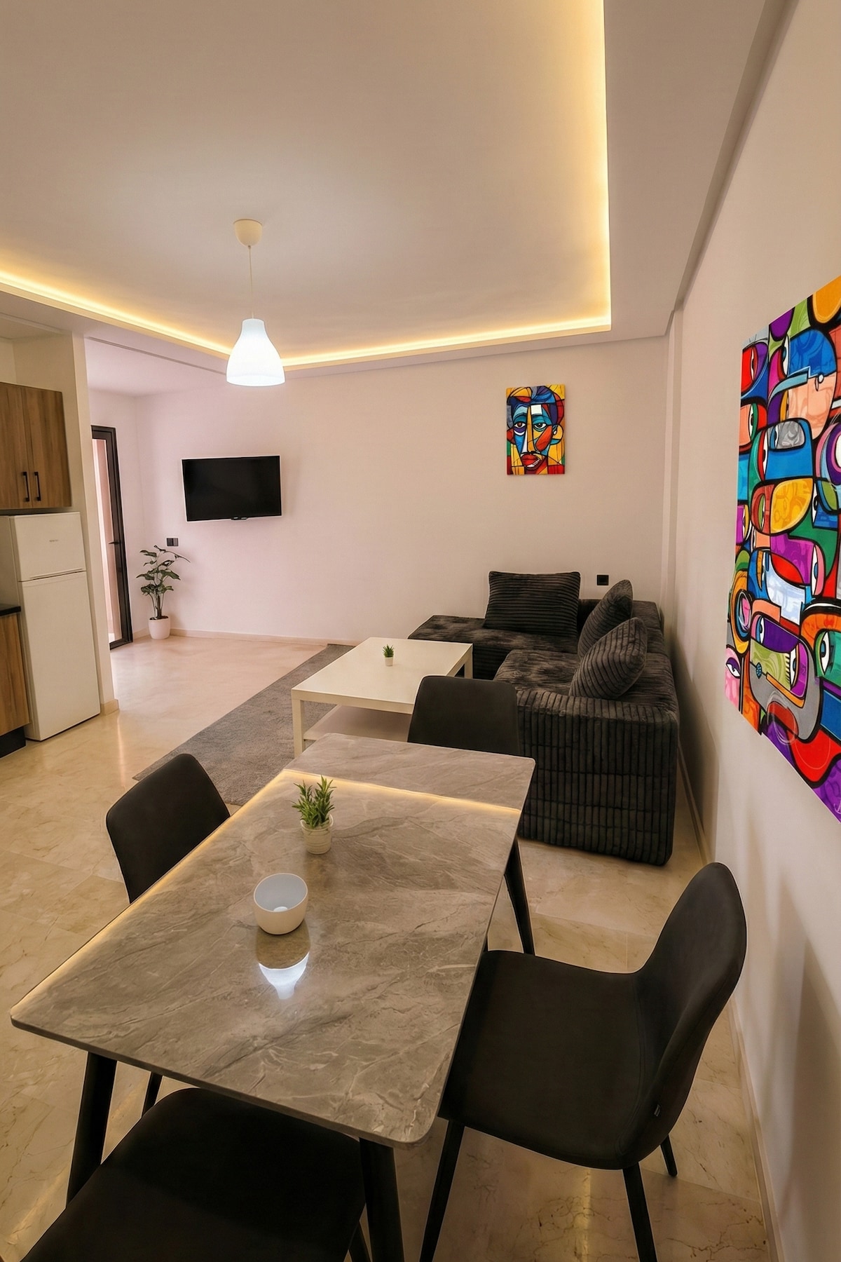 Vue imprenable sur les montagnes de l'Atlas, couchez de soleils et vue sur l'ancienne médina, décoration chaleureuse, qualité de literie et linge de maison, c'est ce qui vous attend dans cet appartement de 110m² situé à proximités des grands axes de la ville. Supermarché, boulangerie et pharmacie en bas de la résidence. Parfait pour les couples, les voyageurs en solo et les voyageurs d'affaires. Il y a des travaux en ce moment dans l’immeuble de 9h à 17h.