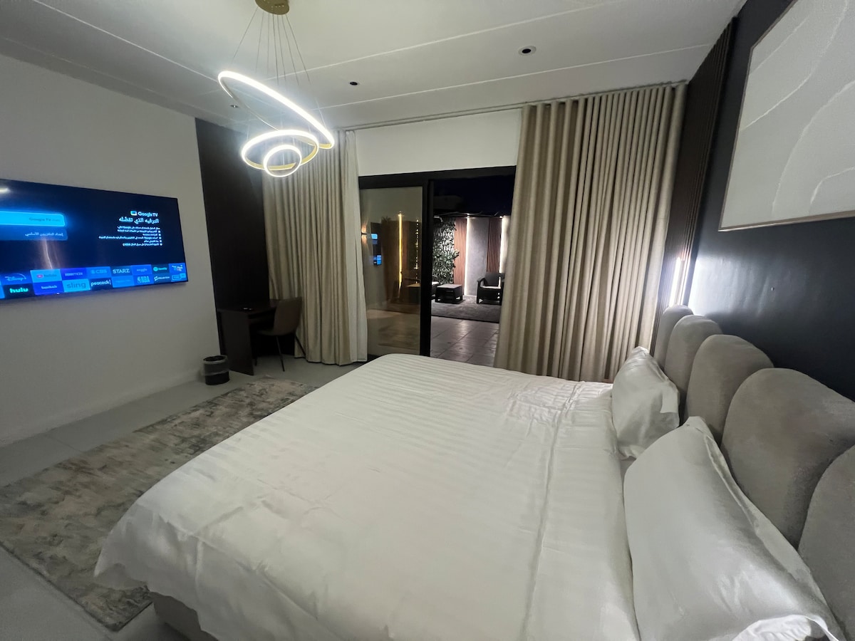 Šim unikālajam mājoklim ir savs stils un ērts un pievilcīgs bohēmisks stils, un to raksturo modernitāte, tīrība un elegance mēbelēs. Tā atrodas arī netālu no Jasmine Mall un King Abdulaziz lidostas. Ēka ir jauna un brīnišķīga ar modernu dizainu, kas jūs noteikti pārsteigs. Piezīme : tā ir atsevišķa istaba ar privātu viedo ieeju ar koplietošanas ēkas pakalpojumiem no lifta un kāpnēm, kā arī privāta viesu autostāvvieta.