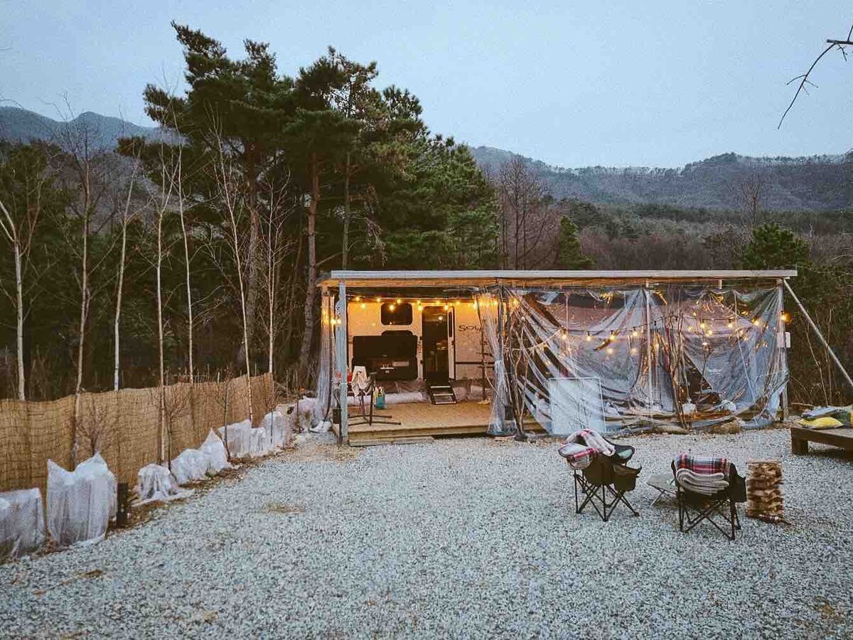 Norobežotā lauku ciemata dzejas telpā, kas ietver skaistus Jeosu un kalnus, Aicinām viesus uz ērtu un tīru treileri. Dzīvojamā piekabe 4-5 cilvēkiem ir dabai draudzīga nojume ar stilīgu interjeru, kā arī dušas telpa, tualete, indukcijas plīts, ledusskapis, televizors, mikroviļņu krāsns un viss pārējais. Nav īpašas vietas, kur piedāvāt nelielu, bet lielāku * atpūtu *. Mēs dāvināsim viesiem skaistas atmiņas un īstu atpūtu kā dāvanu. * Ja tiek pievienots cilvēku skaits, lūdzu, informējiet mani.