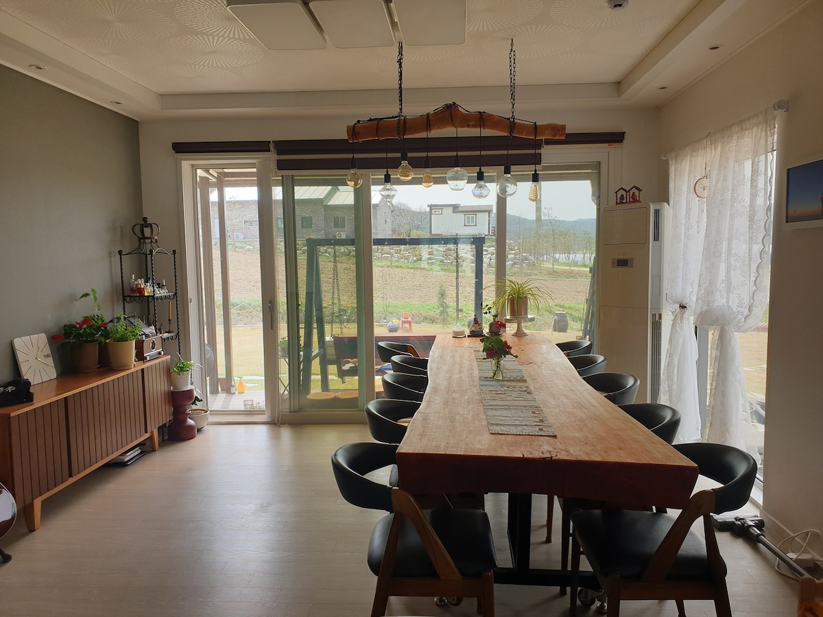 Mūsu naktsmītne ir plaša 25 guļamistabu vienģimenes māja Asan-myeon, Gochang-gun, kur atrodas Seonunsa. Zāle ir plaša, tāpēc varat atstāt labas atmiņas par ģimenes vienību. Ir arī atsevišķa vieta gaļas grilēšanai. (Ir grils) Tuvumā ir Ungokas mitrājs, Goindola muzejs, Gusipo pludmale utt. Jūs varat apskatīt UNESCO aizsargājamo teritoriju. Standarta viesu skaits: 4/Maksimālais viesu skaits: 6 Kokogles un zibenskrūves tiek gatavotas atsevišķi (ir grila grils) Ja vasaras atvaļinājuma laikā ņemat līdzi mazuļu baseinu, varat to izmantot kļavas ēnā.