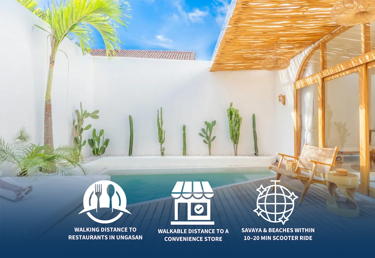 De'Oasis ir mūsdienīga tropu dizaina villa, kas celta 2022. gada februārī. Villa ir patiesa oāze, kur jūs varat būt mierīgi un atpūsties, baudot elpu aizraujošu skatu. Atrodas Bukit apgabala augstākajā punktā dažu minūšu attālumā no pludmalēm sērfošanai vai atpūtai, Pepito, Savajā, Baltajā klintī utt. 3 stāvu ēka ar 2 guļamistabām ar balkonu un gultām, no kurām paveras skats uz okeānu. Dzīvojamā istaba un virtuve 1. stāvā, guļamistabas 2. un 3. stāvā.
