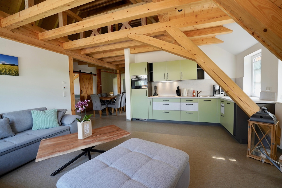 Unsere Familiensuite „Lerchenberg“ verfügt über einen Wohn- und Essbereich und eine Küche. Das große Badezimmer ist mit einer ebenerdigen Dusche, WC. In den 3 Schlafräumen befinden sich 1 Doppelbett, 1 Einzelbett und 1 Etagenbett. Es besteht die Möglichkeit von 2 Aufbettungen und Nutzung einer zweiten Ferienwohnung mit 4 Betten. In der Ferienwohnung sind der Bettwäsche- und Handtuchservice inbegriffen. Die Endreinigung nach dem Check Out gehören ebenfalls standardmäßig zu unserem Service.