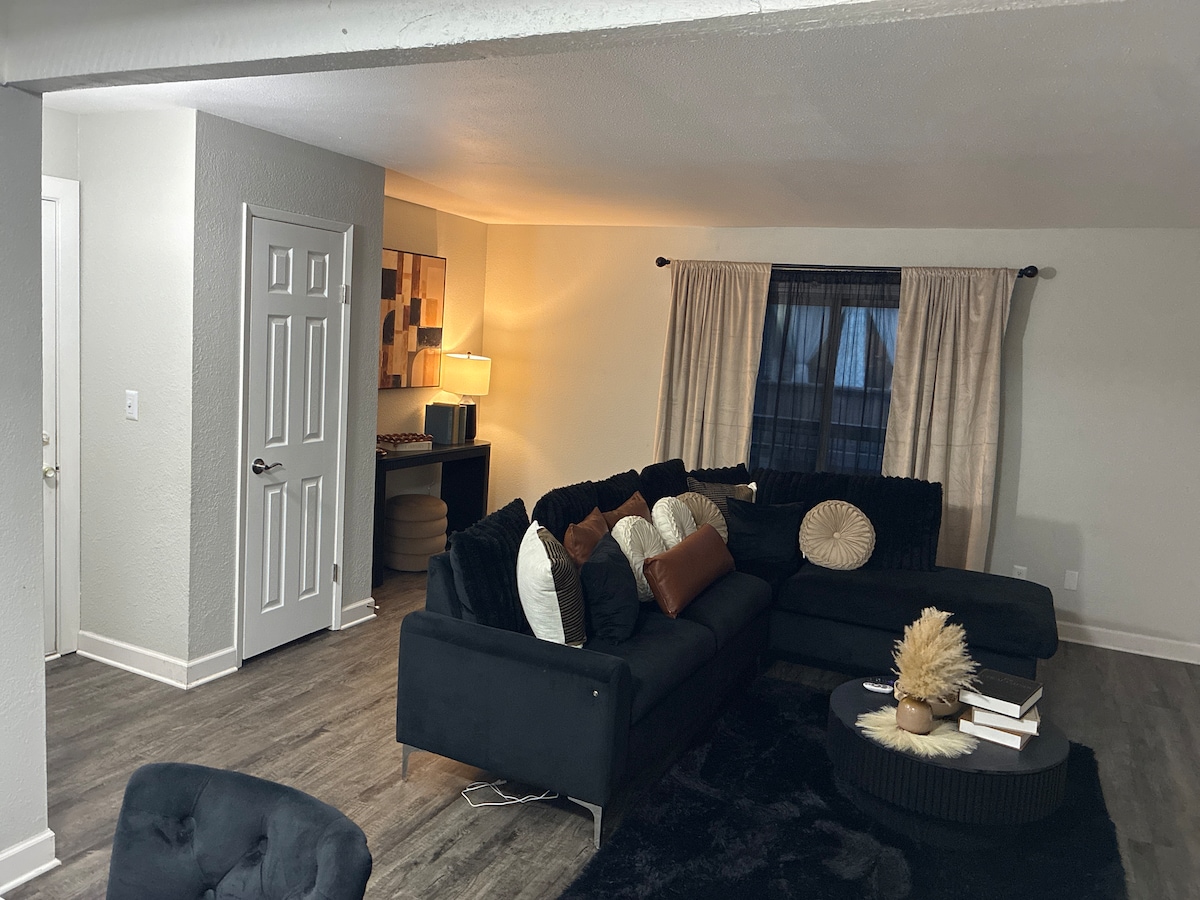 ✿Viena King izmēra gulta (divi cilvēki) un viens Queen izmēra piepūšamais matracis (divi cilvēki) ✿Izbaudiet mājīgu un dīvainu mājokli, kas jūtas dzīvi ✿Šī ir vienistabas vienība ar atvērtu koncepciju. Tādējādi guļamistabā nav durvju. ✿Privāta autostāvvieta ārpus ielas tieši dzīvokļa priekšā, ļoti ērta piekļuve ✿55collu 4K Roku TV ✿Ātrgaitas Wi-Fi ✿Klēpjdatoram gatava darbstacija ✿Suņu parks dzīvokļu kompleksā ✿1.4mi līdz Overland Park konferenču centram, 4 minūšu brauciens