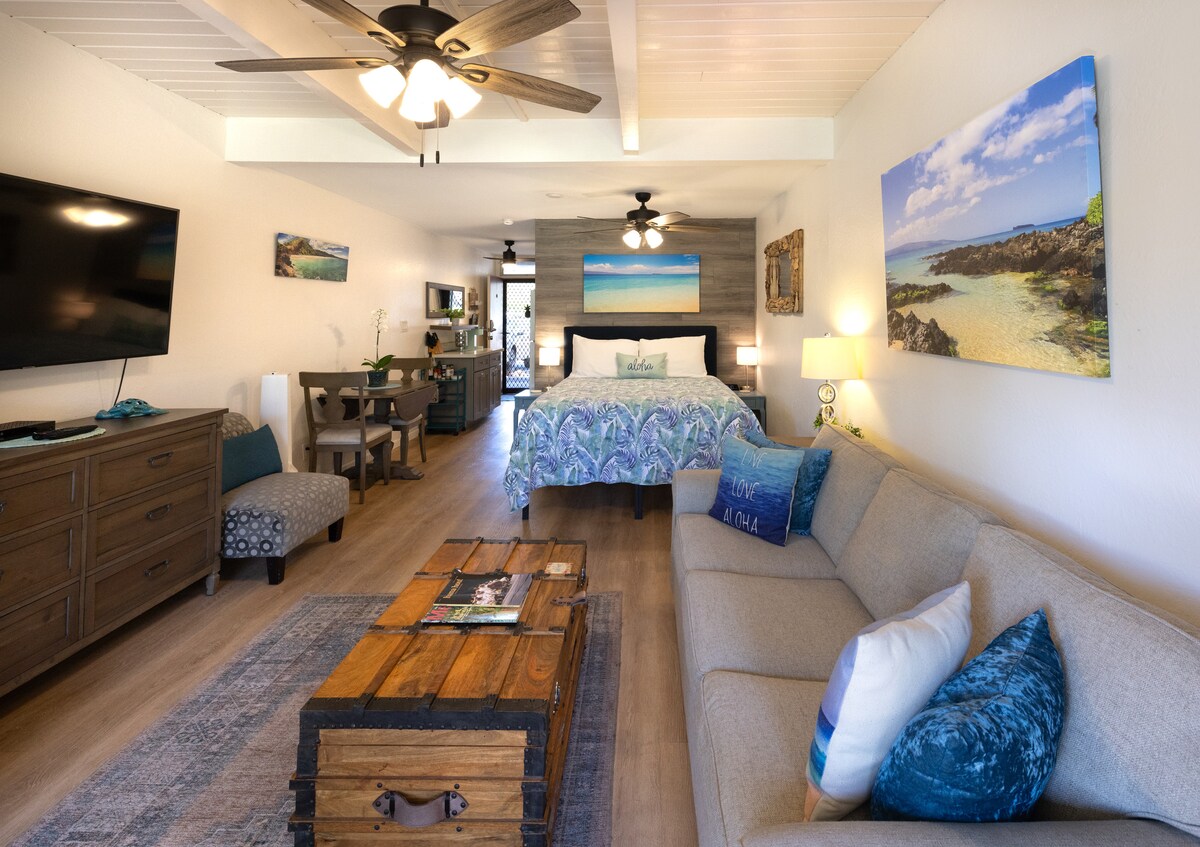 Halerentals MAK A5 ir pilnībā atjaunots dzīvoklis pludmales tuvumā ar augstākās klases materiāliem. RH mēbeles, kokvilnas palagi, marmora duša, gardēžu virtuve un a/c katrā istabā - tikai dažu soļu attālumā no neattīstītas pludmales! Gaišs, plašs pirmā stāva 1 gultas/1 vannas dzīvoklis ar pilnībā aprīkotu virtuvi un skatu uz pludmali, līci un Haleakala vulkānu. King RH dīvāngulta viesistabā līdz 4 viesiem. Ideāli piemērots peldēšanai, SUP, snorkelēšanai un sērfošanai - apbrīnojama vērtība ģimenēm un pāriem.