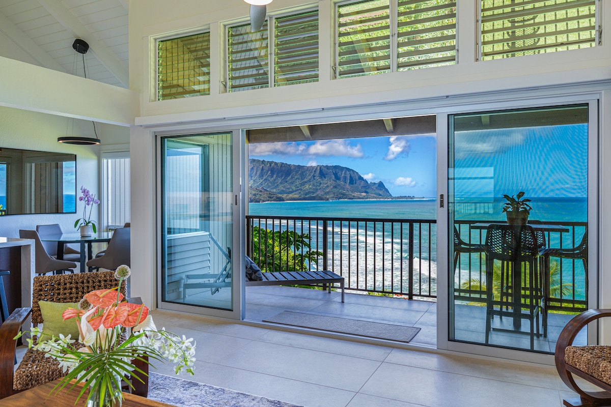 No šīs modernās un nesen atjaunotās medusmēneša pludmales atpūtas mājokļa paveras elpu aizraujošs skats uz okeānu un piekrasti. Atpūtieties dienas gultā, skatoties uz plašo vistu no Anini rifa līdz Kilauea bākai. Daži ir teikuši: "Jūtos kā uz kuģa jūrā", vērojot vaļus, kas salūzt okeānā, un viļņus, kas no šīs maģiskās vietas lidinās rifā. Reta penthausa vienība ar augstiem griestiem, skatu no katras istabas, pat slavenais Bali Hai no klāja. Patiesi pāra sapnis!