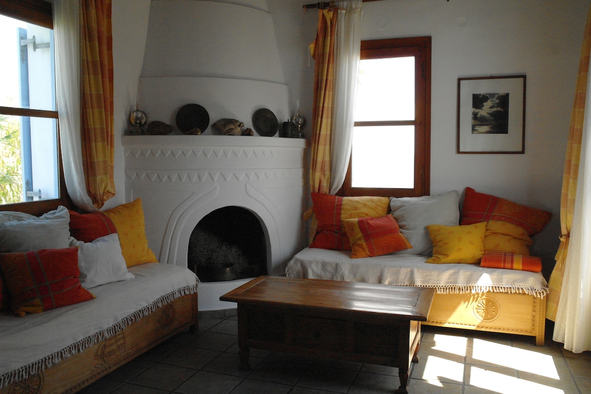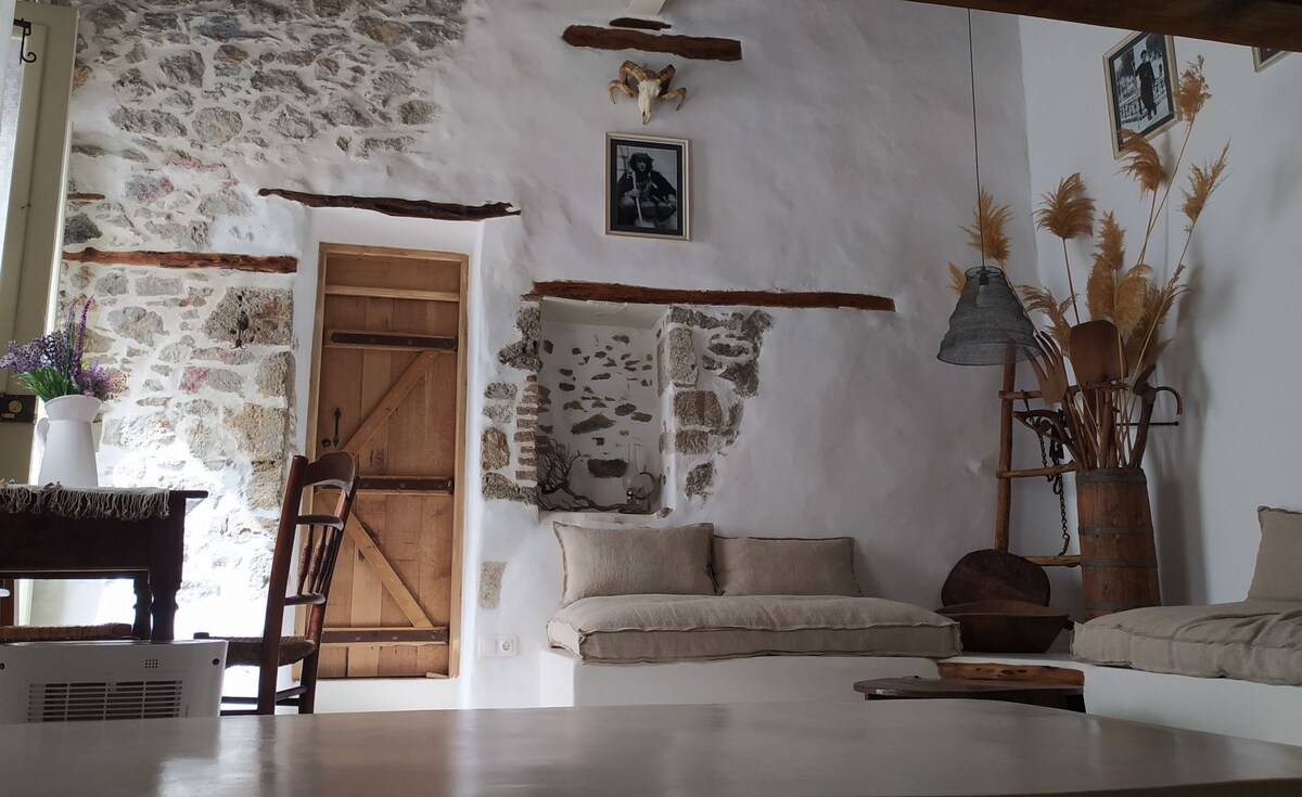 Izcila atrašanās vieta:atrodas 4000 m2 lielā dārzā un tikai 3 min. gājiena attālumā līdz pludmalei, 20 min. attālumā no lidostas, starp ostu un galveno Skyros ciematu. Atrodoties restorānu un mini tirgus tuvumā, šīs piejūras mājas ļauj apmeklētājiem izbaudīt daudzas brīvā laika aktivitātes, piemēram, peldēšanu, niršanu, izjādes ar zirgiem un pārgājienus. Atjaunota 2020. gada ziema ar cieņu un mīlestību pret salas tradicionālo arhitektūru. Māja sastāv no atklātas telpas bez atsevišķām istabām.